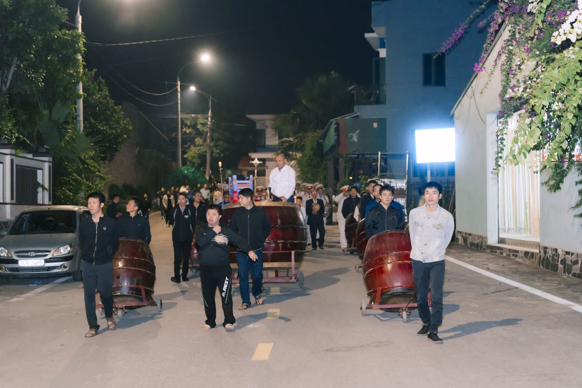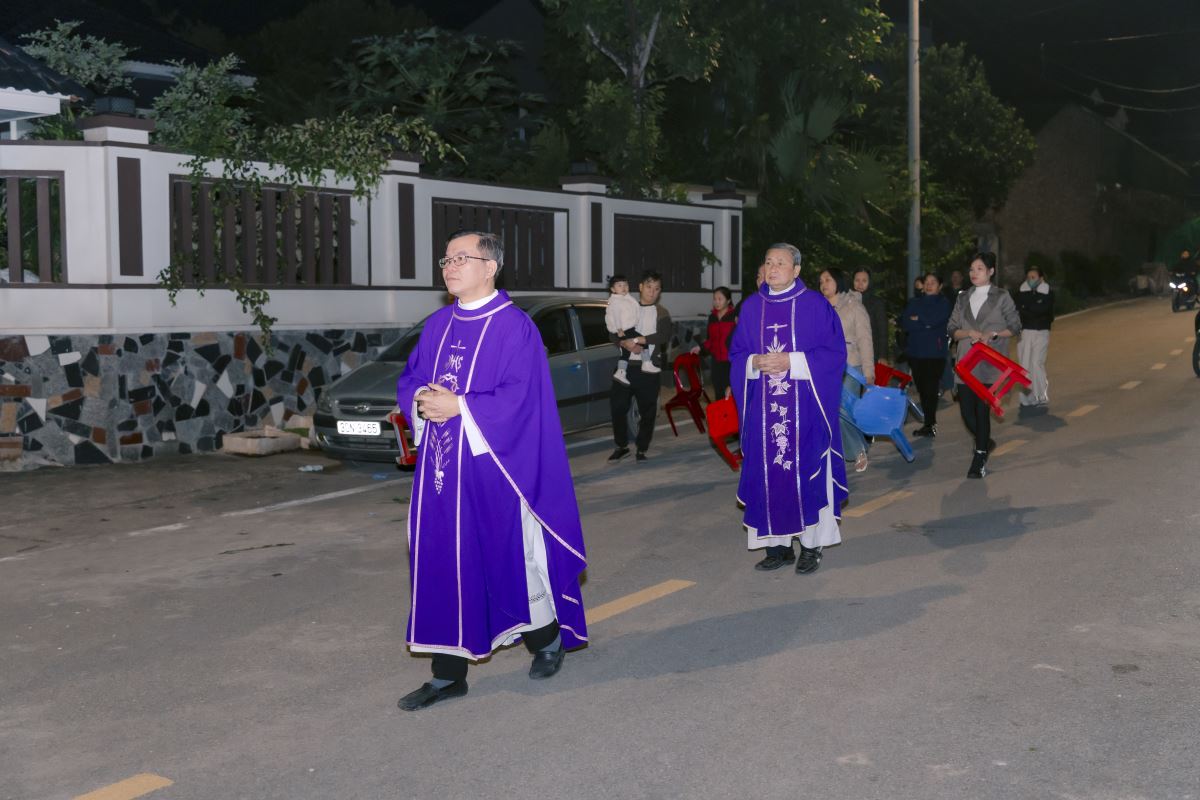 Đồng hồ điểm 19 giờ, tiếng trống âm vang, hòa quyện cùng tiếng kèn đồng réo rắt, trầm bổng, rước quý cha từ nhà thờ đi ra Vườn thánh, quý cha tiến lên lễ đài trong lời ca nhập lễ đầy tín thác vào sự Phục sinh của Đức Kitô.