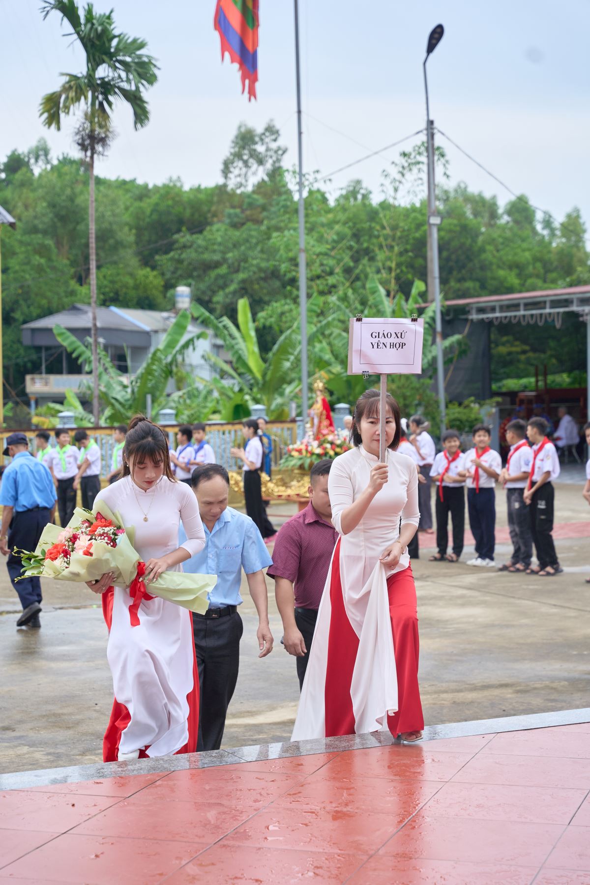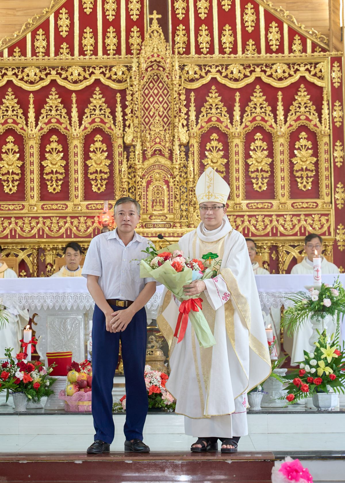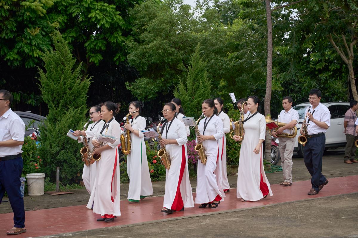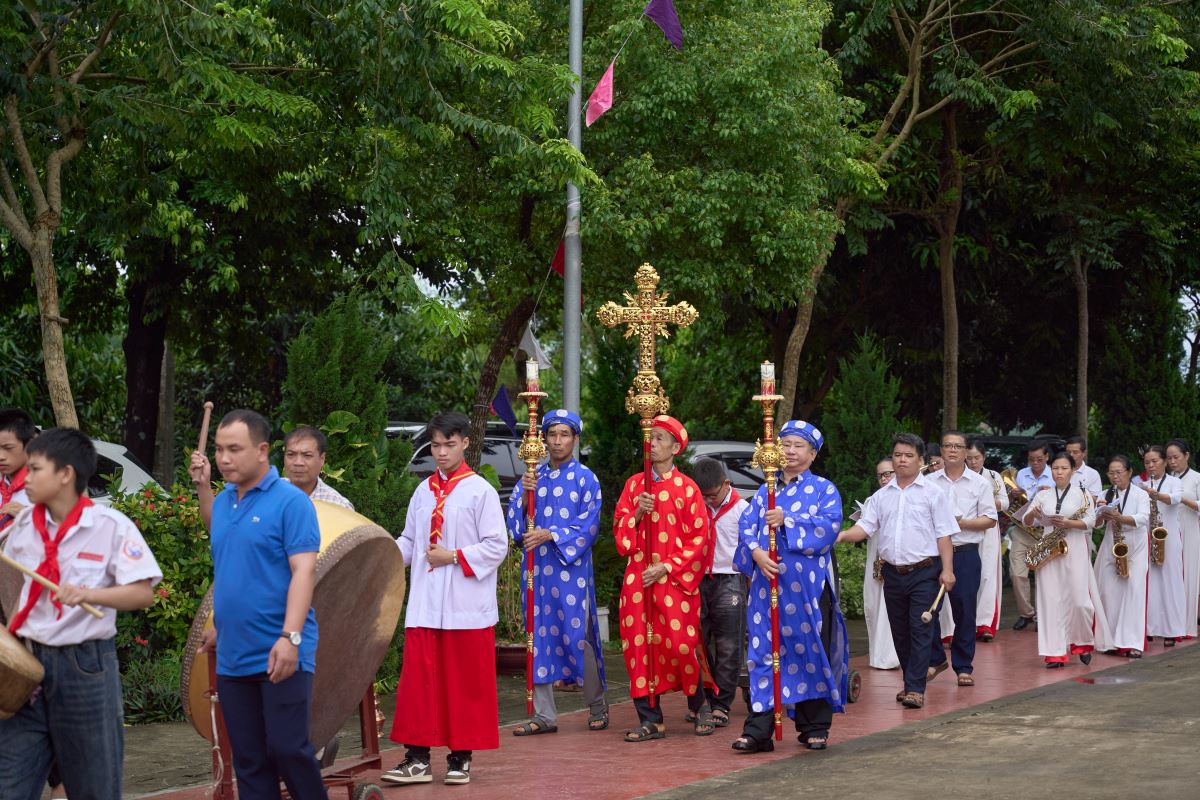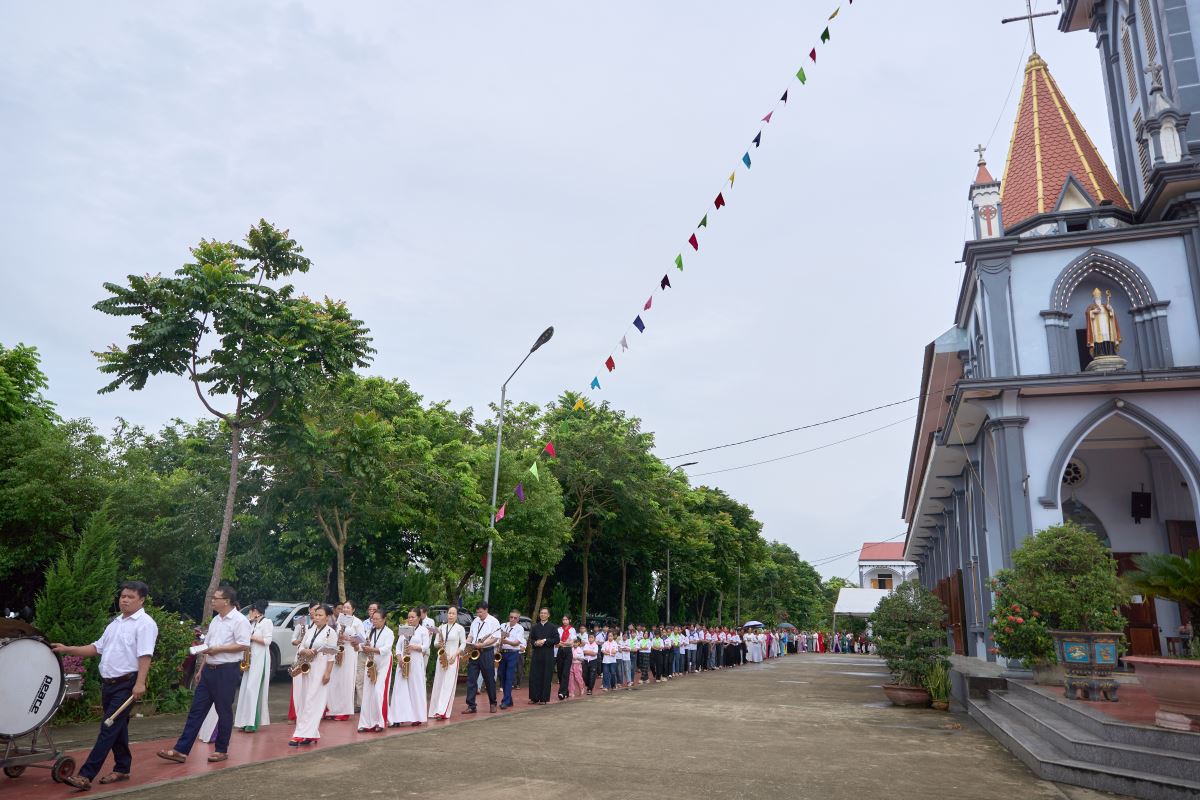 Ngay từ sáng sớm, khuôn viên nhà thờ rộn ràng cờ hoa, tiếng trống, tiếng kèn. Trước Thánh lễ, các giáo họ trực thuộc và giáo xứ bạn tiến lên dâng hoa chúc mừng, như lời cầu nguyện và sẻ chia niềm vui với cộng đoàn Mậu A trong ngày trọng đại. Đây cũng là dấu chỉ sống động của tình hiệp thông huynh đệ trong cùng một Giáo hội, đồng thời trở thành nguồn động viên quý báu, giúp giáo xứ Mậu A vững bước trên hành trình xây dựng và phát triển đời sống đức tin.