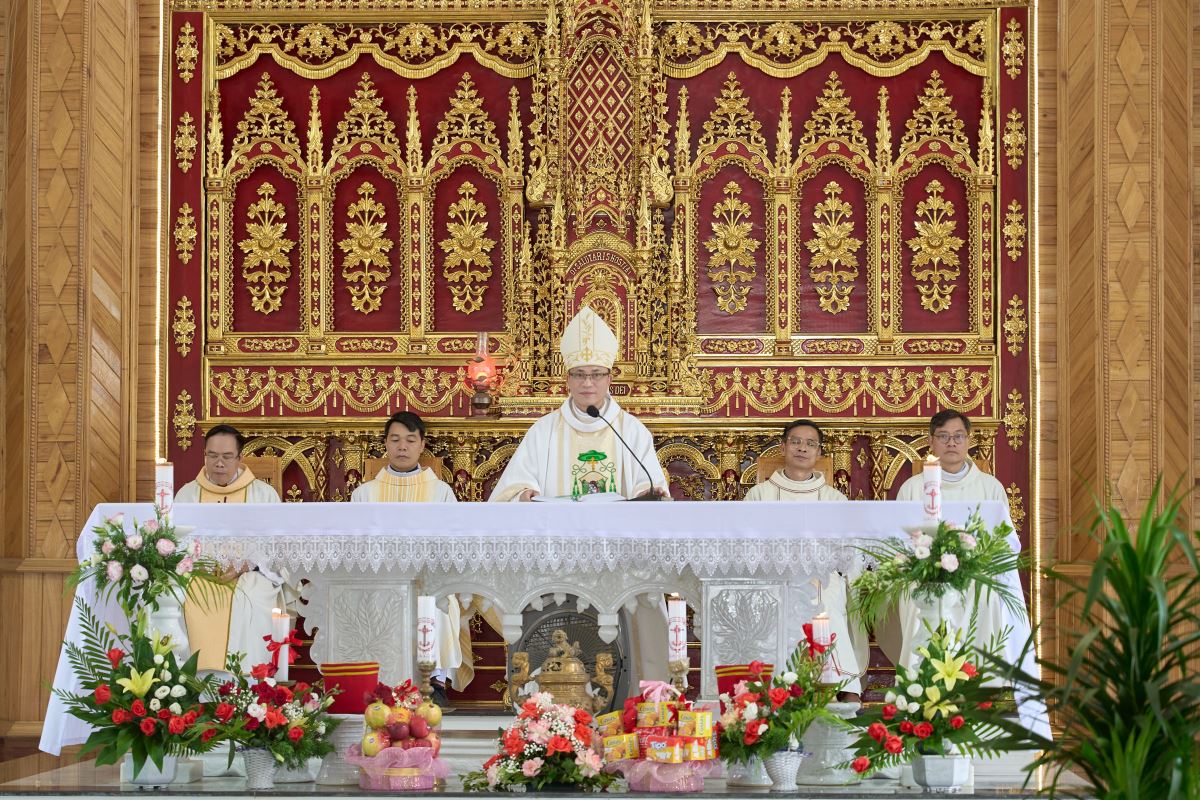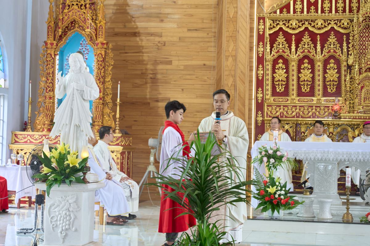 Thánh lễ được cử hành lúc 9g45. Trong phần mở đầu, Đức Cha Phaolô nhấn mạnh ý nghĩa của việc mừng bổn mạng Đức Maria Nữ Vương: noi gương và phó thác cho Mẹ, đồng thời ý thức rằng việc công bố Chuẩn xứ là một cột mốc trưởng thành trong đời sống cộng đoàn, đi kèm trách nhiệm dấn thân xây dựng Giáo hội tại địa phương.