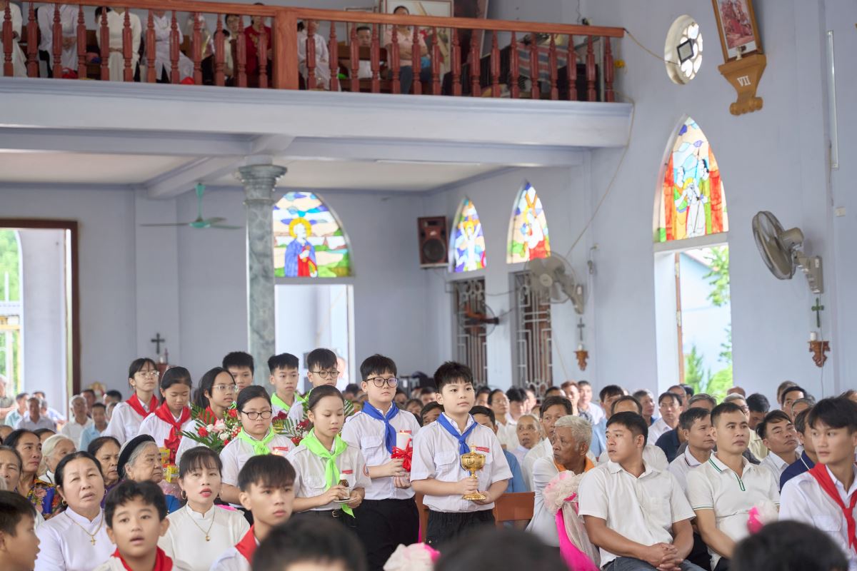 Thánh lễ tiếp tục với phần Phụng vụ Thánh Thể sốt sắng. Các em thiếu nhi tiến dâng lễ vật, như của lễ tạ ơn Thiên Chúa và biểu tượng lòng thành kính của cộng đoàn.