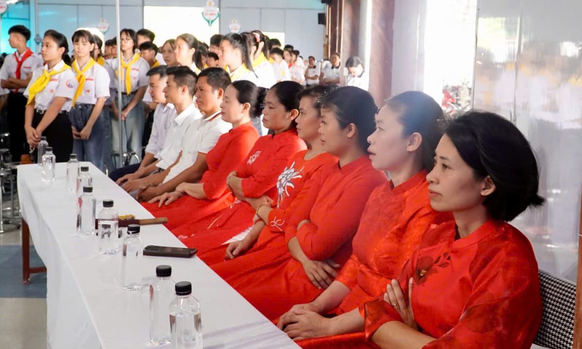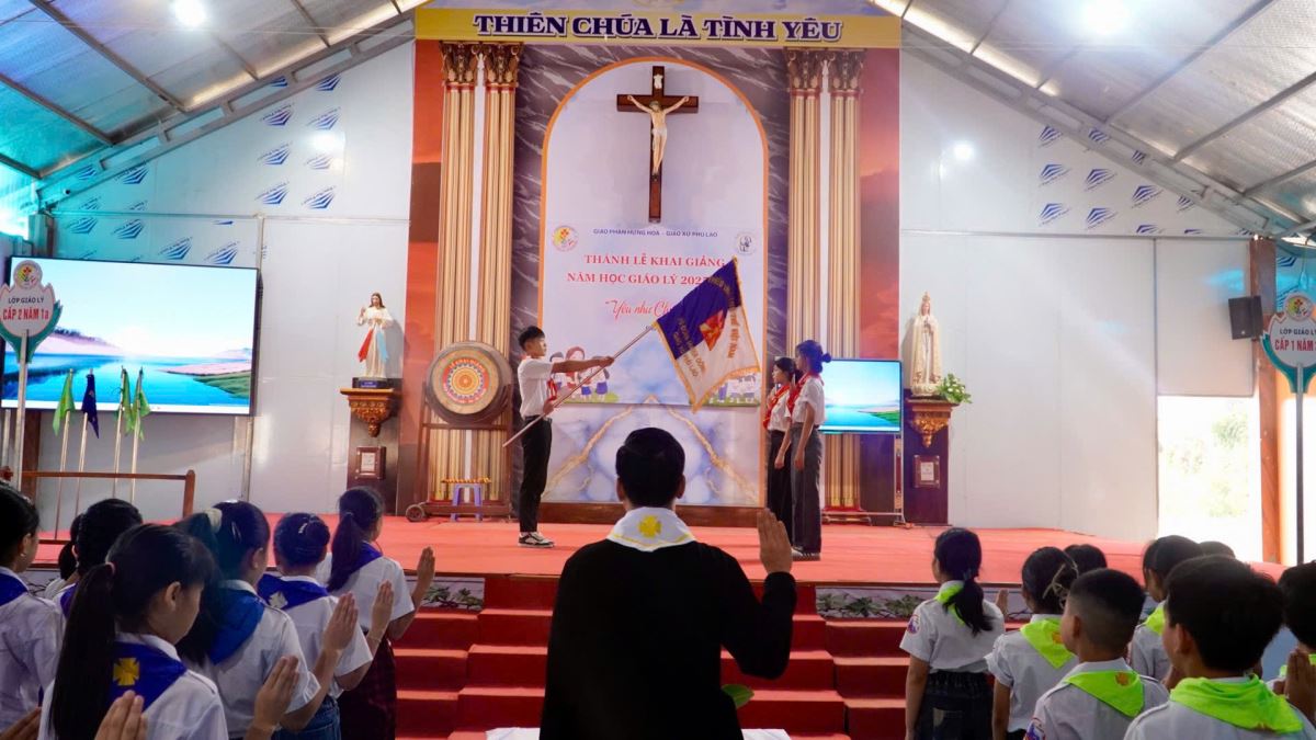 Đúng 07g15, chương trình khai giảng năm học giáo lý mới được khai mạc với nghi thức chào cờ. Tham dự lễ khai giảng có sự hiện diện của cha xứ Giuse Trần Minh Trọng, thầy xứ, quý dì, quý Hội đồng Mục vụ Giáo xứ, quý phụ huynh, quý thầy cô Giáo lý viên, các anh chị huynh - dự trưởng, quý cộng đoàn cùng gần 700 em thiếu nhi trong toàn xứ.