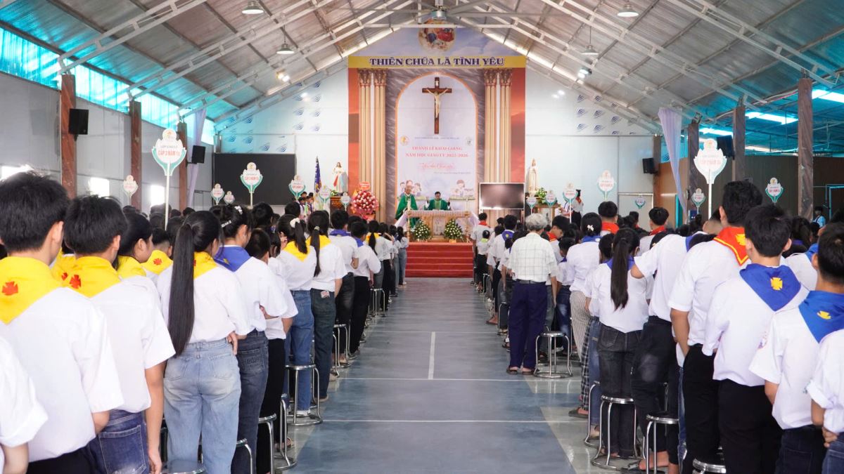 Đỉnh cao của ngày khai giảng là Thánh lễ cầu nguyện cho các em trong năm học mới, diễn ra vào lúc 08g45, do cha xứ Giuse Trần Minh Trọng chủ tế. Đồng tế trong thánh lễ còn có cha Giuse Kiều Oanh.
