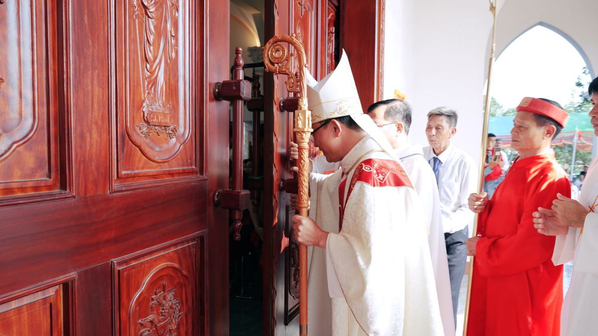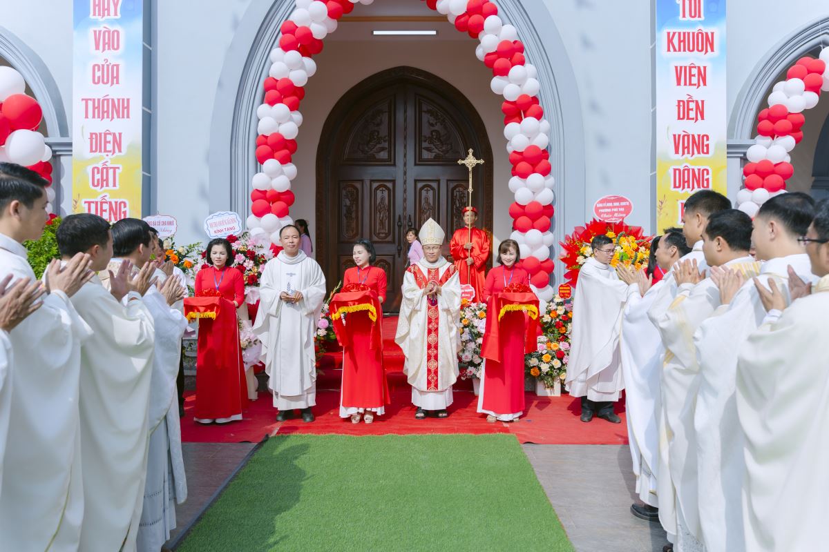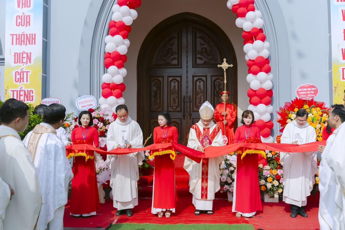Đúng 9h00, đoàn rước đồng tế tiến vào tiền sảnh nhà thờ trong tiếng kèn trống rộn ràng, chuẩn bị nghi thức cắt băng khánh thành. Tiếp đó, Đức cha Phaolô mở cửa nhà thờ, cùng đoàn đồng tế tiến lên cung thánh để cử hành Thánh lễ Tạ ơn.