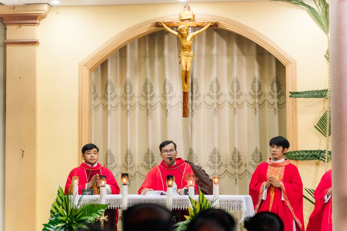 Sau khi đọc bài Thương Khó, cha Giuse Bùi Công Dũng đã chia sẻ với cộng đoàn chủ đề: “Sống đức tin vững vàng giữa đám đông.” Lễ Lá nhắc lại biến cố Đức Giêsu vào thành Giêrusalem giữa tiếng tung hô của dân chúng, nhưng cũng chính họ sau đó lại đòi đóng đinh Ngài. Cha mời gọi mỗi người xét lại đức tin của mình: đừng chạy theo đám đông, nhưng biết phân định và trung thành. Đức Giêsu là Vua Hòa Bình, Đấng tự nguyện bước vào cuộc khổ nạn vì yêu thương nhân loại.