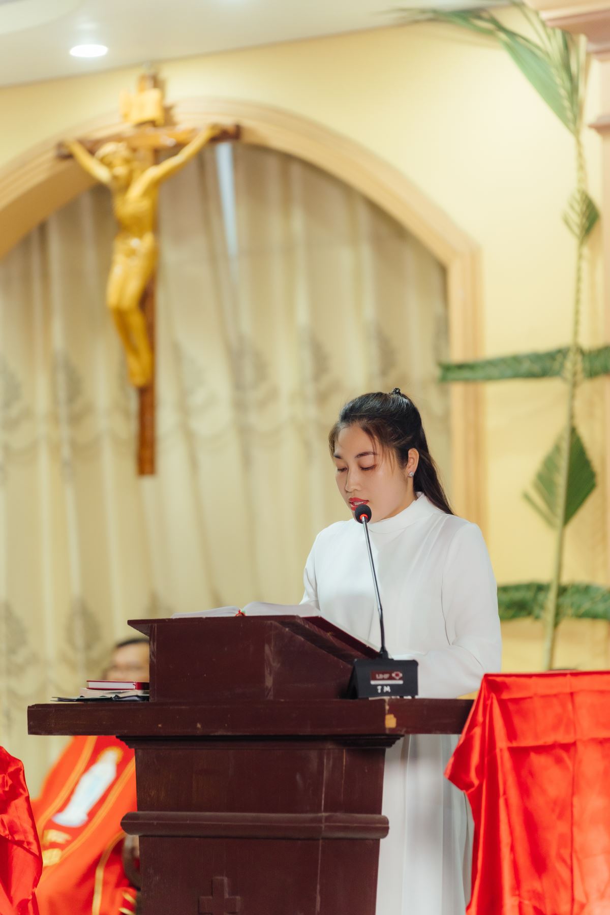 Nghi thức làm phép lá được cha xứ Giuse cử hành cách trang nghiêm tại cuối nhà thờ trước khi đoàn rước tiến về lễ đài để tiếp tục cử hành Thánh lễ.