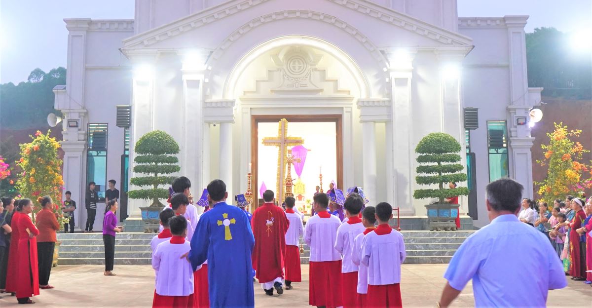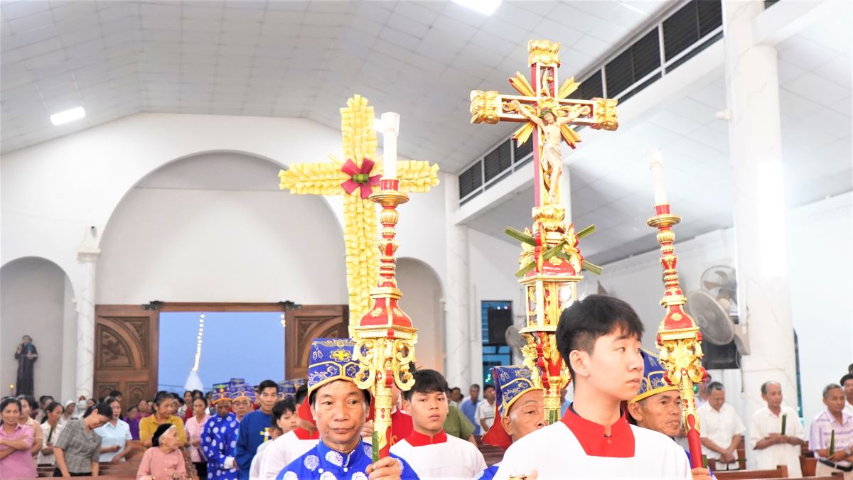 Đúng 5 giờ 30 sáng, Cha Giuse đã cử hành nghi thức làm phép lá tại khu vực cuối tháp nhà thờ. Sau đó, đoàn rước long trọng tiến vào thánh đường, mở đầu cho Thánh lễ.