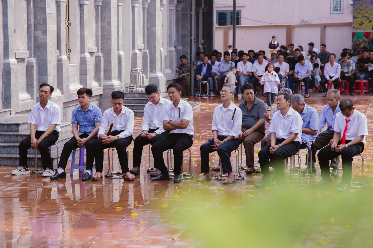 Ngay từ sớm, khuôn viên nhà thờ đã rộn ràng trong niềm vui và sự chuẩn bị trang nghiêm. Nghi thức làm phép lá được cử hành tại tiền sảnh nhà thờ. Những cành lá xanh tươi trên tay cộng đoàn như tái hiện lại hình ảnh dân thành Giêrusalem xưa tung hô Chúa Giêsu tiến vào thành thánh. Sau nghi thức làm phép lá, đoàn rước tiến vào Nhà thờ trong tiếng hát hoan ca, diễn tả niềm tin và lòng tôn kính đối với Đức Kitô – Vua Hòa Bình.