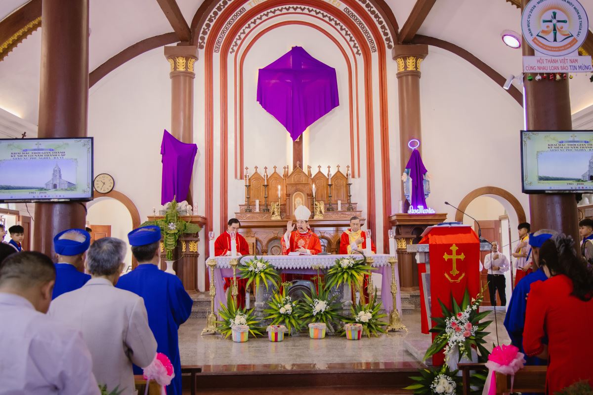 WGPHH - Trong bầu khí linh thiêng và sốt sắng của toàn thể Giáo Hội bước vào Tuần Thánh, vào lúc 9g00 sáng Chúa nhật Lễ Lá, cộng đoàn dân Chúa tại Giáo xứ Phú Nghĩa đã long trọng cử hành Thánh lễ Lá và khai mạc Thời Gian Thánh kỷ niệm 125 năm thành lập giáo xứ (1901–2026). Thánh lễ do Đức Cha Đaminh Hoàng Minh Tiến chủ sự, cùng quý cha, với sự hiện diện đông đảo của cộng đoàn giáo dân.