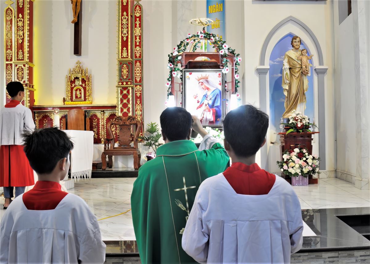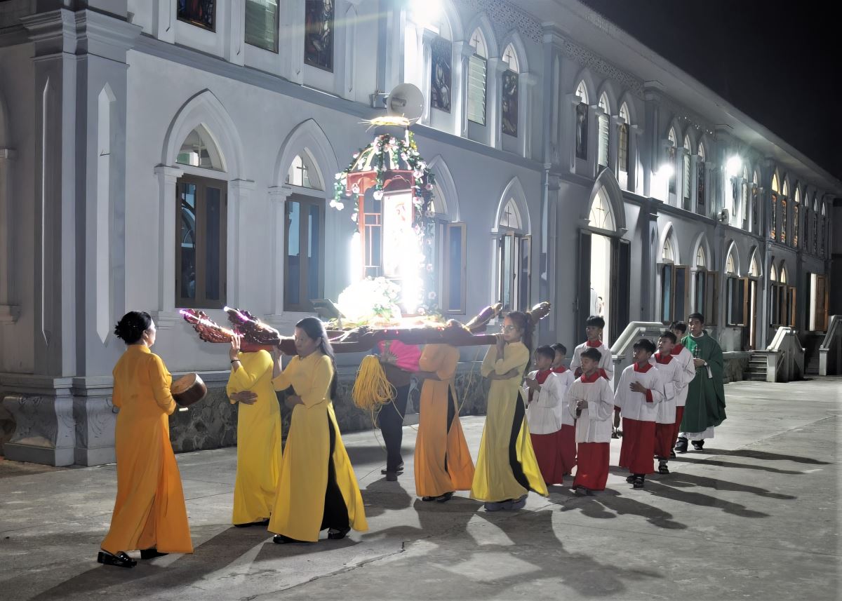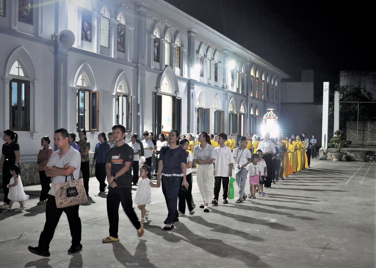 Đặc biệt, vào lúc 19h00, cộng đoàn tham dự nghi thức cung nghinh kiệu Đức Mẹ quanh khuôn viên nhà thờ trong bầu khí trang nghiêm và sốt sắng.