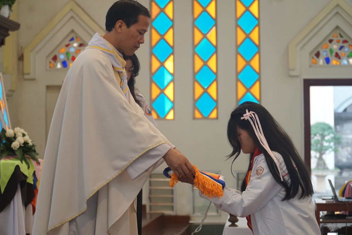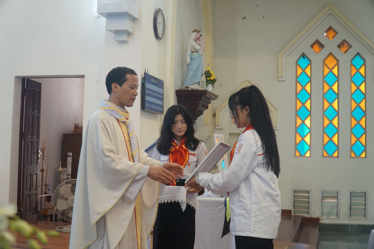 Phần cuối cùng của nghi thức là trao cờ Đoàn cho Ban Điều hành Xứ đoàn Đa Minh Savio, trước khi cộng đoàn cùng bước vào nghi thức chào cờ phong trào TNTT trong bầu khí long trọng và đầy cảm xúc.