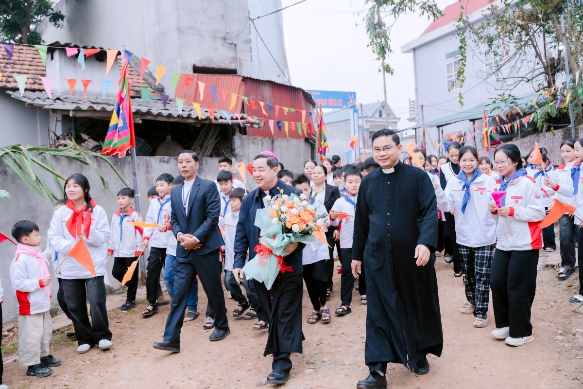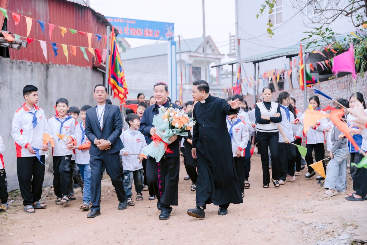 Đến 8g45, Cha xứ Giuse Phan Văn Luật cùng đội trống Hiền Nam, Cây Trâm, các em thiếu nhi và cộng đoàn long trọng chào đón Đức cha Đaminh Hoàng Minh Tiến tại cổng chào. Sau đó, Đức cha cùng cộng đoàn bước vào khuôn viên giáo họ trong tiếng trống rộn ràng, xen lẫn những tràng vỗ tay và tiếng reo vui hồn nhiên của các em nhỏ, như lời chào thân thương và lòng kính mến dành cho vị chủ chăn giáo phận.