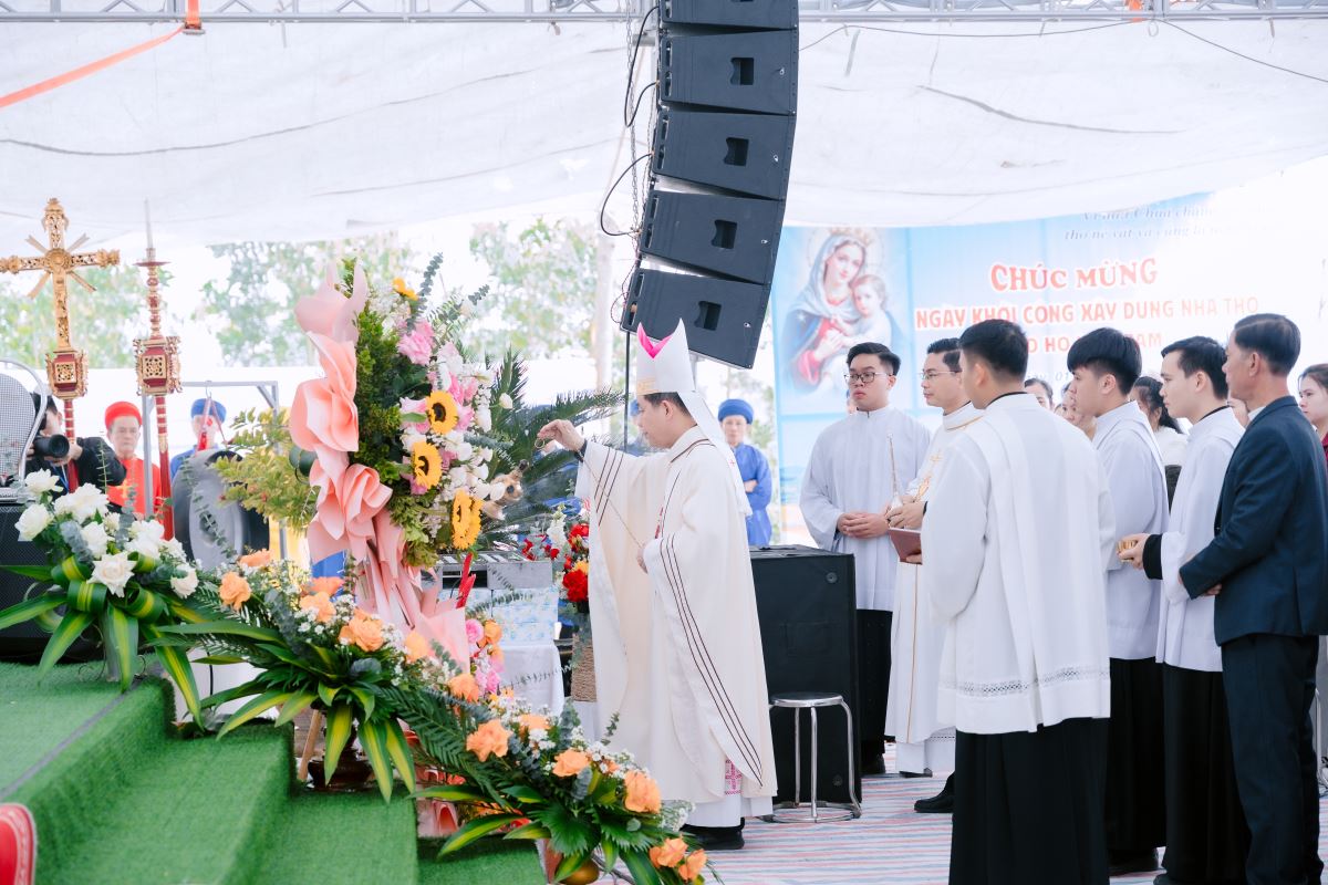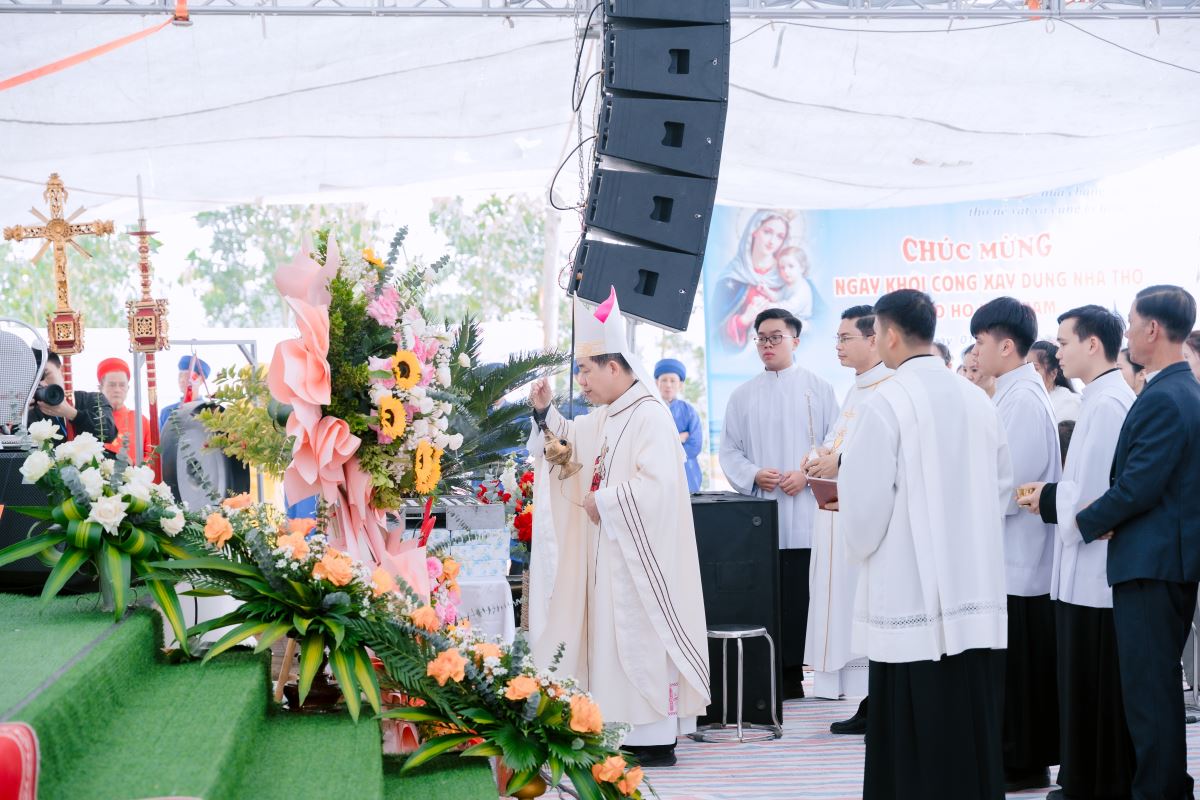 Tiếp đó, Đức cha long trọng cử hành nghi thức làm phép đất, làm phép viên đá góc tường và những viên gạch tượng trưng cho sự chung tay góp sức của các ân nhân trong công trình xây dựng nhà thờ mới.