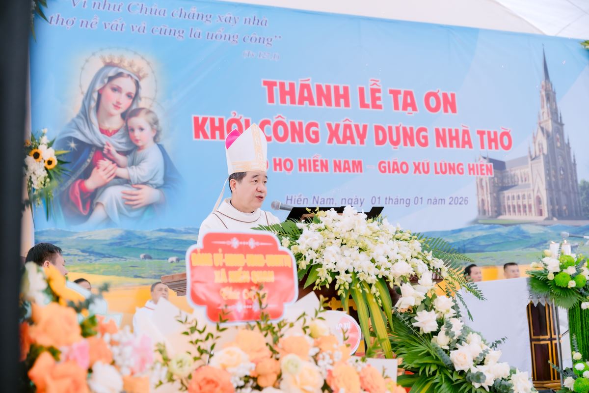 Trong bài giảng, Đức cha nhấn mạnh: “Hồng ân Thiên Chúa đang tuôn đổ xuống mảnh đất giáo họ Hiền Nam trong ngày lễ kính Đức Maria – Mẹ Thiên Chúa, Quan Thầy của giáo họ. Hôm nay, việc khởi công xây dựng nhà thờ không chỉ là dựng nên một công trình vật chất, mà còn mời gọi mỗi người giáo dân dâng lên Chúa những ‘viên gạch’ thiêng liêng của đời sống đức tin, bác ái, quảng đại, yêu thương và dấn thân phục vụ, để xây dựng Nước Trời ngay từ đời sống hôm nay.”