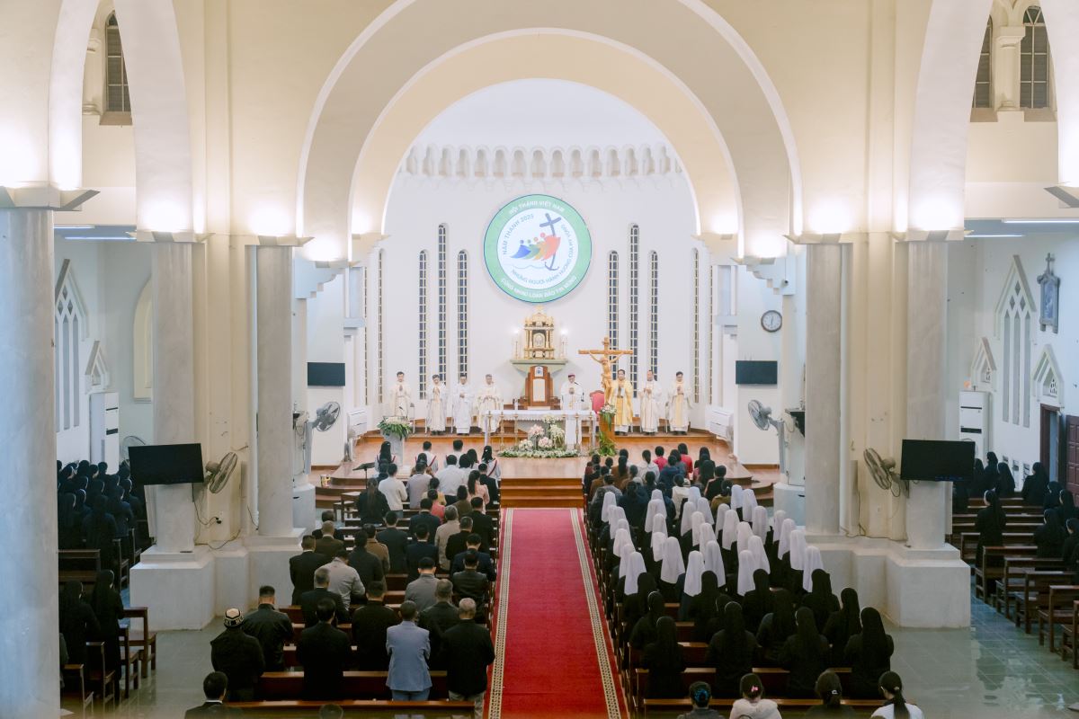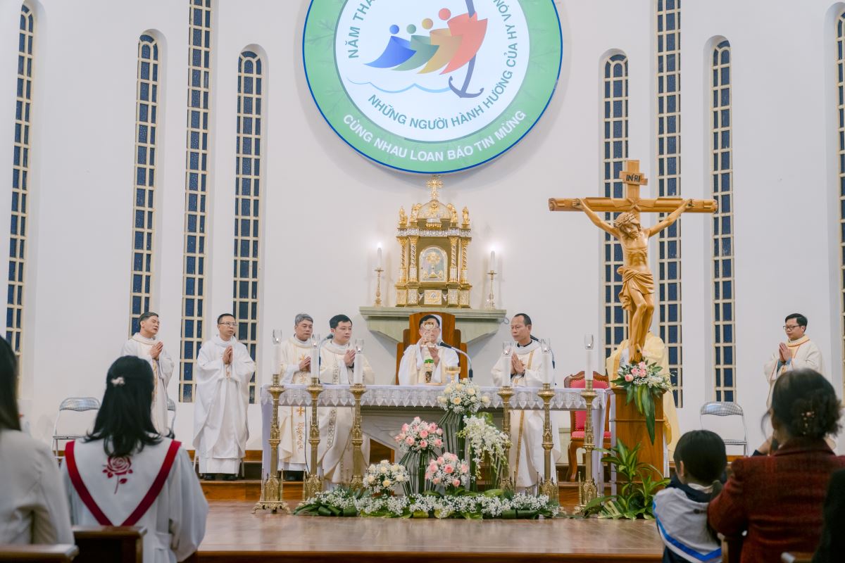 WGPHH – Trong bầu khí trang nghiêm và thấm đượm tâm tình tạ ơn, lúc 18g00 ngày 28.11.2025, tại Nhà thờ Chính tòa Sơn Lộc, Đức cha Phaolô Nguyễn Quang Đĩnh, Giám mục Phụ tá Giáo phận Hưng Hóa, đã chủ sự Thánh lễ mừng kỷ niệm 20 năm hồng ân linh mục của ngài và bốn người anh em cùng lớp. Năm linh mục này là những tiến chức đã được Đức Hồng y Crescenzio Sepe truyền chức linh mục vào sáng ngày 29.11.2005 tại Nhà thờ Chính tòa Hà Nội, trong tổng số 57 phó tế đến từ nhiều giáo phận, trong đó có năm tiến chức thuộc Giáo phận Hưng Hóa.