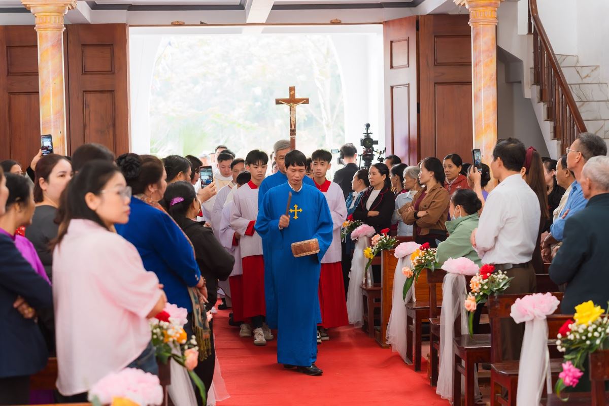 Sau nghi thức làm phép chuông, đoàn rước long trọng tiến vào nhà thờ để cử hành nghi thức làm phép nhà thờ.