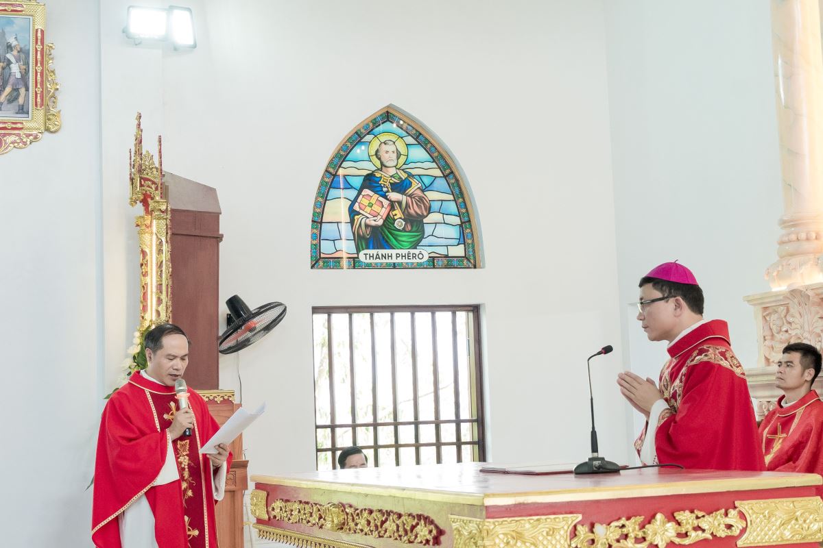 Sau bài giảng, để mở đầu nghi thức ban bí tích Thêm Sức, cha xứ Giuse Nguyễn Gia Huấn giới thiệu các ứng viên lãnh nhận bích tích cho Đức cha Phaolô.