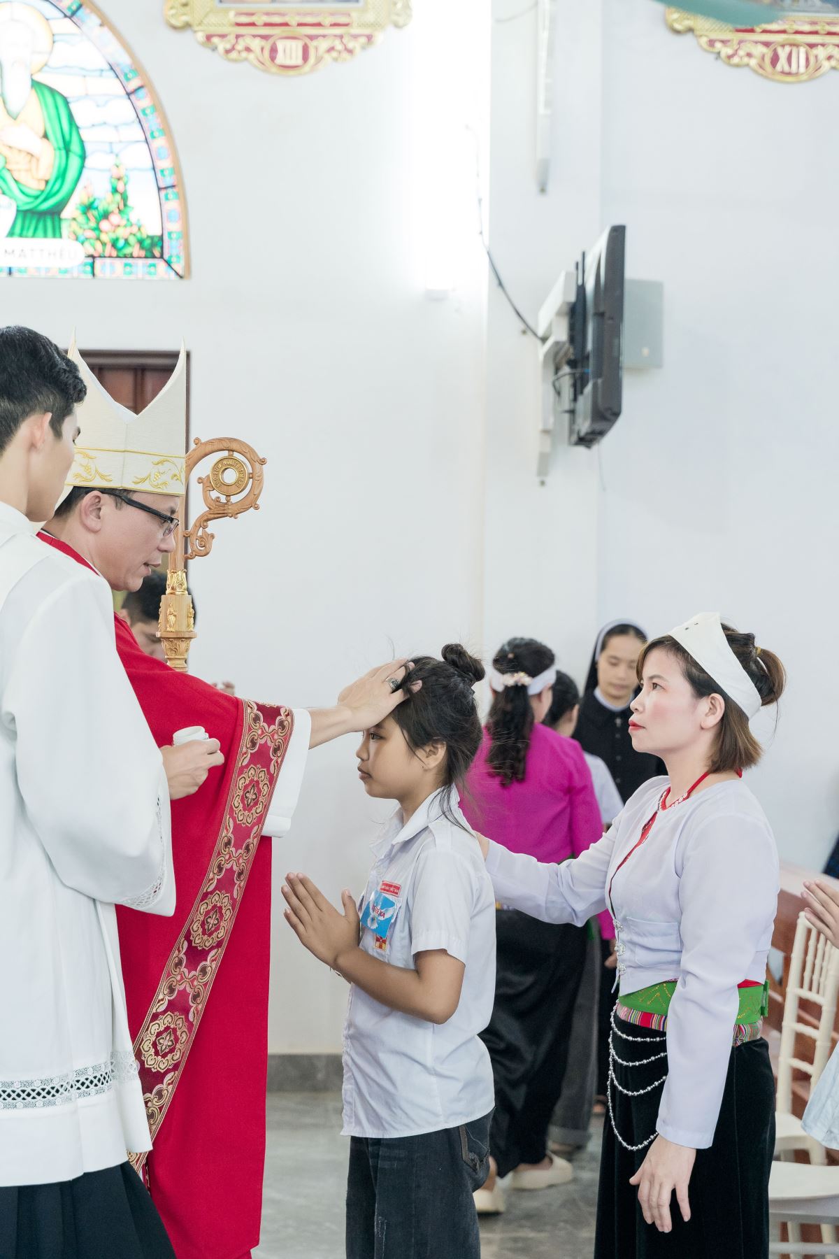 Sau đó, các em kính cẩn cúi đầu lãnh nhận ơn Chúa Thánh Thần qua lời nguyện của Đức cha chủ sự.