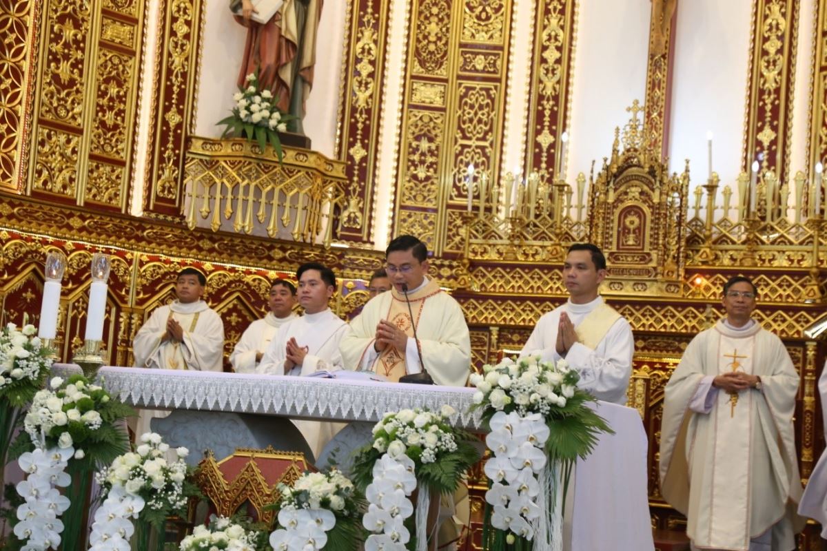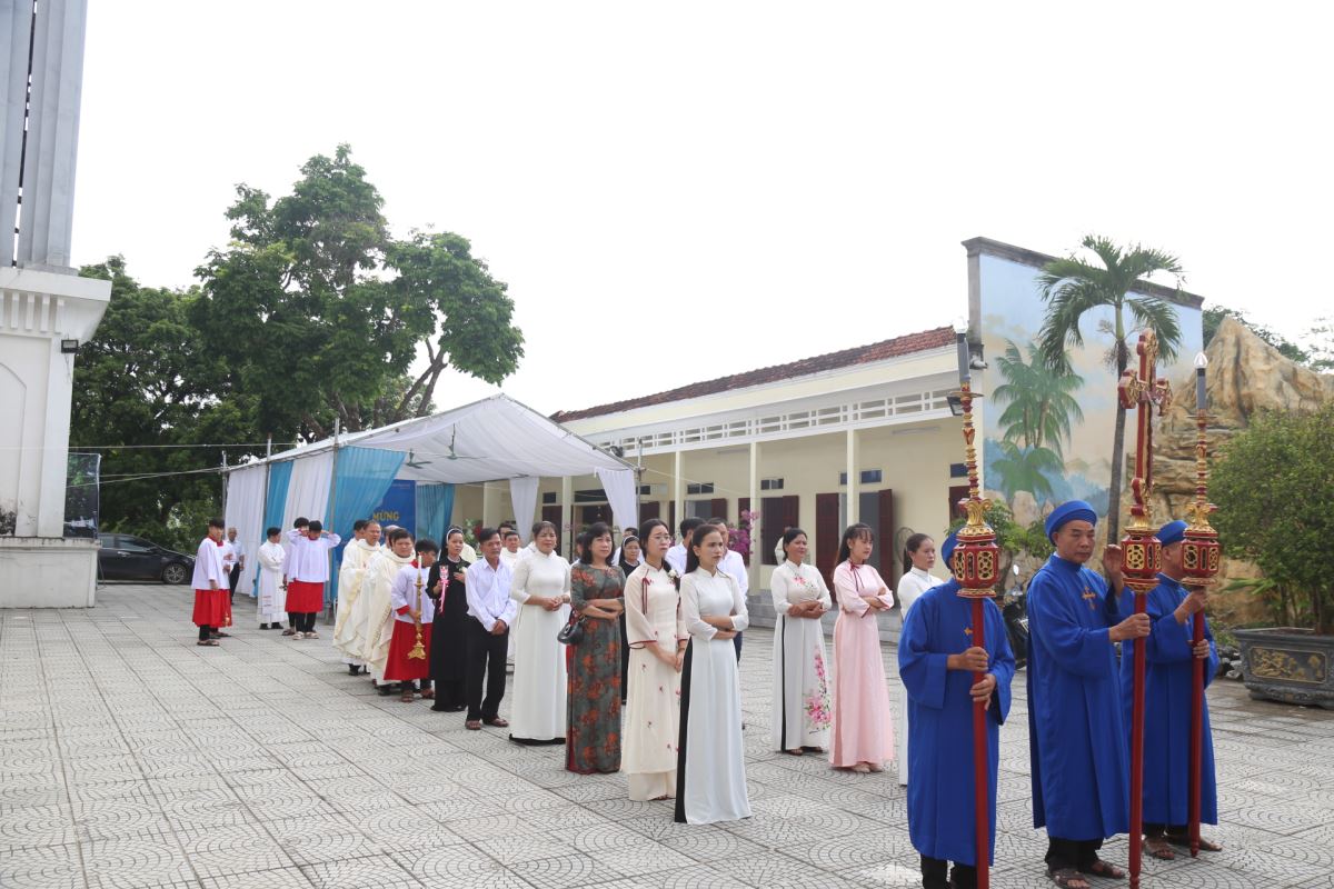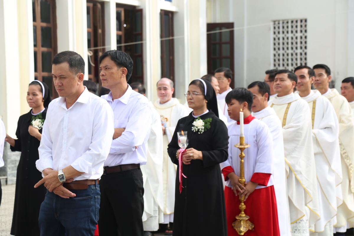 Đúng 08g25 phút, tiếng trống vang dội tấu lên cùng với giai điệu hân hoan của bài ca nhập lễ. Từ sân nhà, thờ đoàn đồng tế tiến vào thánh đường để hiệp dâng Thánh lễ tạ ơn, do Cha xứ Giuse Phan Văn Luật chủ tế.