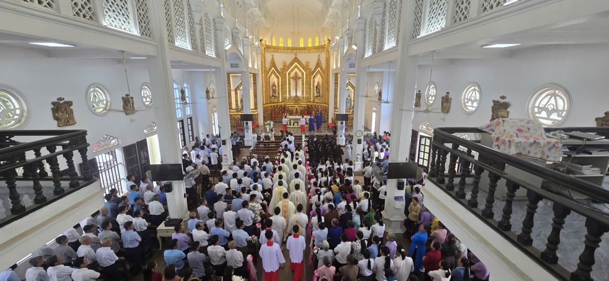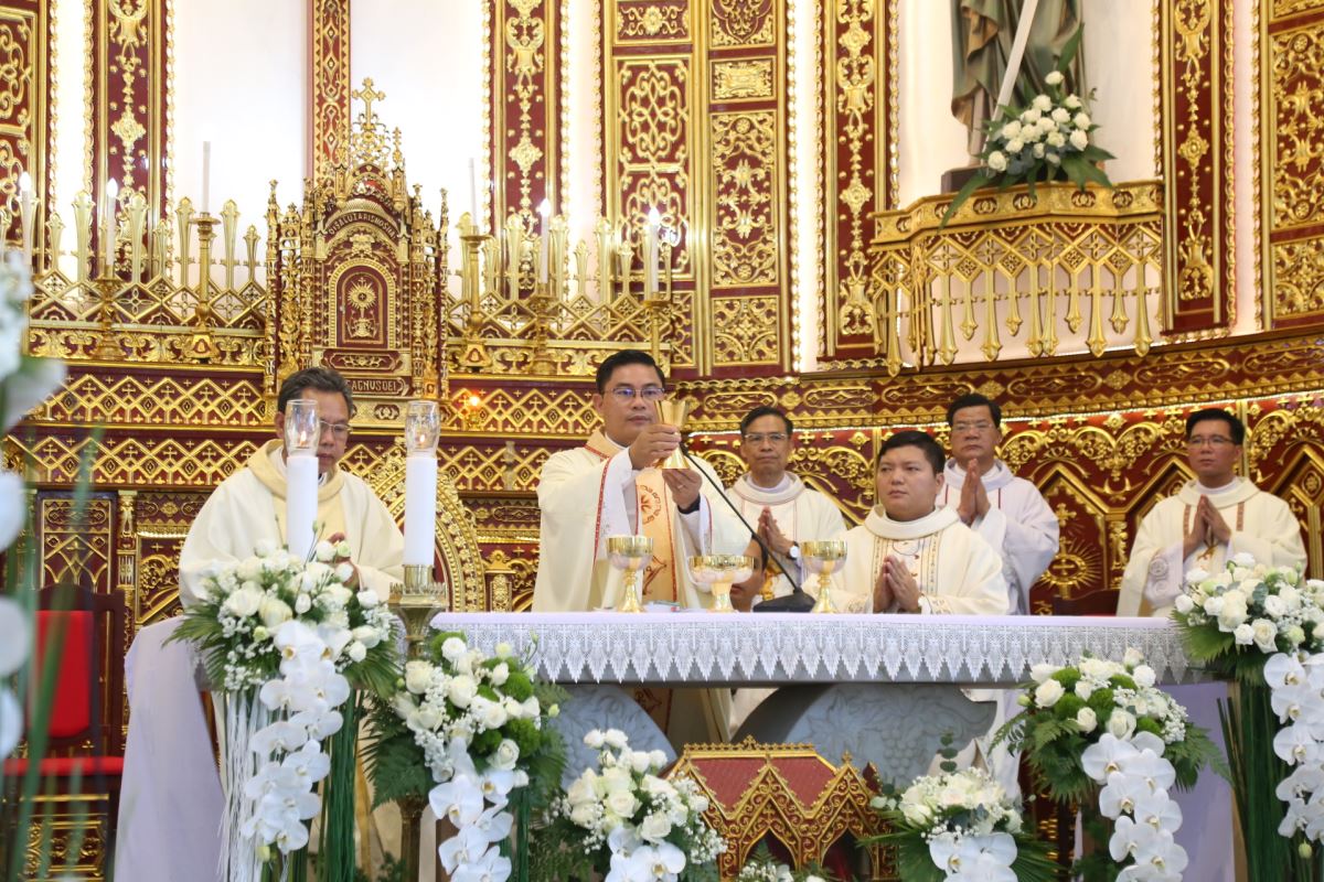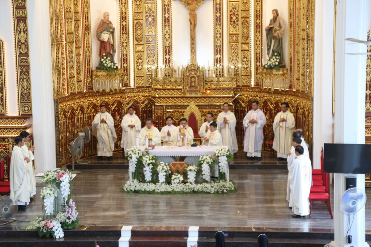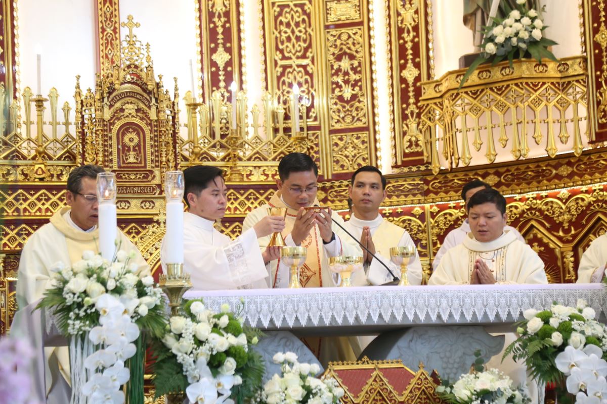 Đúng 08g25 phút, tiếng trống vang dội tấu lên cùng với giai điệu hân hoan của bài ca nhập lễ. Từ sân nhà, thờ đoàn đồng tế tiến vào thánh đường để hiệp dâng Thánh lễ tạ ơn, do Cha xứ Giuse Phan Văn Luật chủ tế.