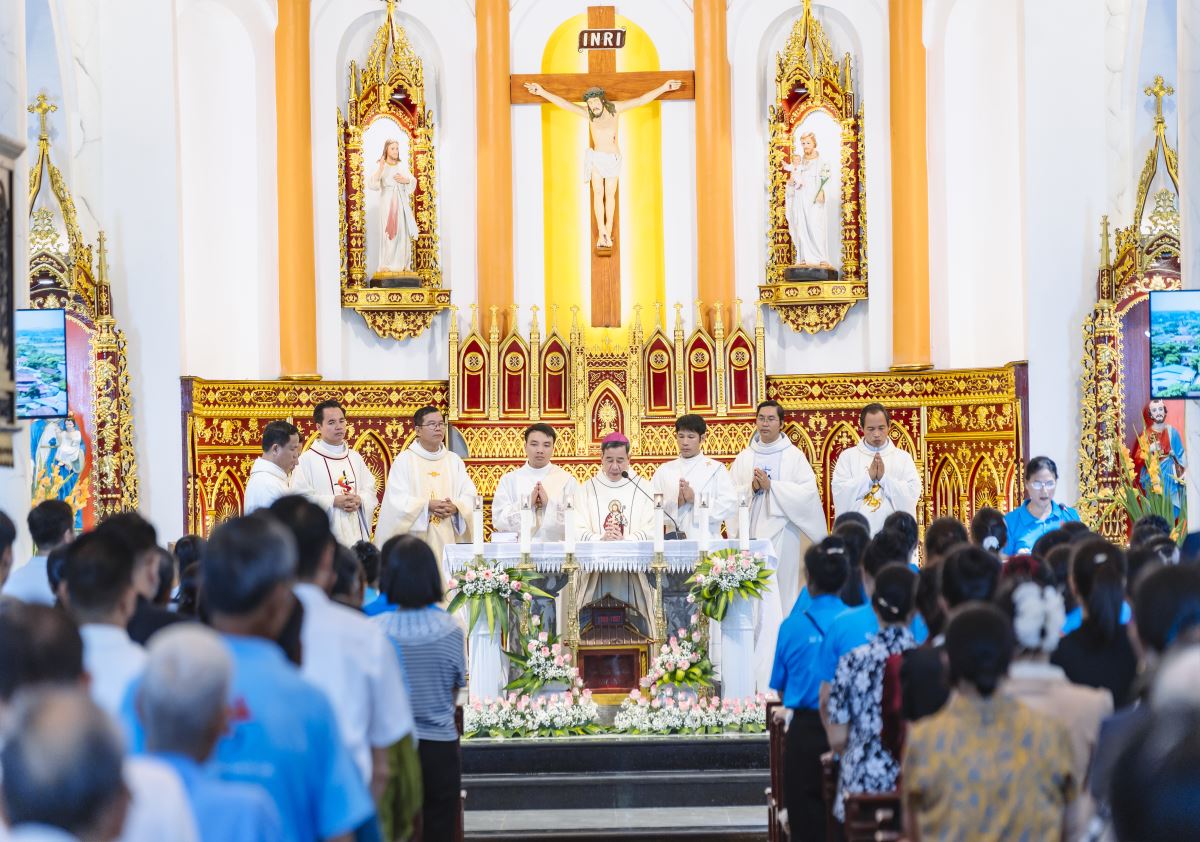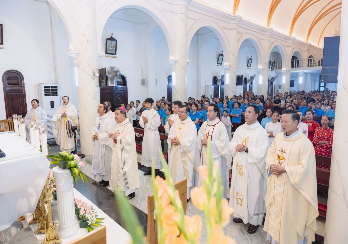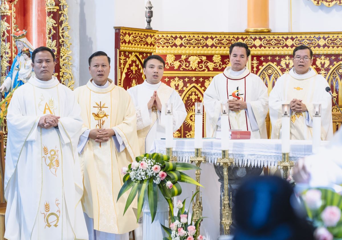 Đỉnh cao của buổi gặp mặt là Thánh lễ tạ ơn, do Đức cha Đaminh Hoàng Minh Tiến - Giám mục Chính tòa giáo phận Hưng Hóa chủ tế. Đồng tế với Đức cha trong Thánh lễ có cha xứ Giuse Nguyễn Văn Yêm, cha Chưởng ấn Phêrô Lê Quốc Hưng, quý cha Dòng Hiến sĩ Đức Mẹ Vô Nhiễm, quý cha khách. Hiệp dâng Thánh lễ có quý thầy, quý dì, quý hội đồng giáo xứ và Ban hành giáo, quý thành viên Bác ái Hiến sĩ và đông đảo bà con giáo dân trong giáo xứ. Đoàn đồng tế tiến lên cung thánh trong lời Thánh ca hân hoan: “Chúng con về nới đây dâng ngàn tiếng ca, chúng con về nơi đây để tạ ơn Thiên Chúa…”