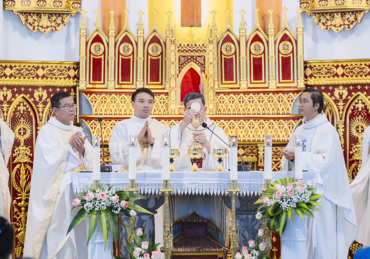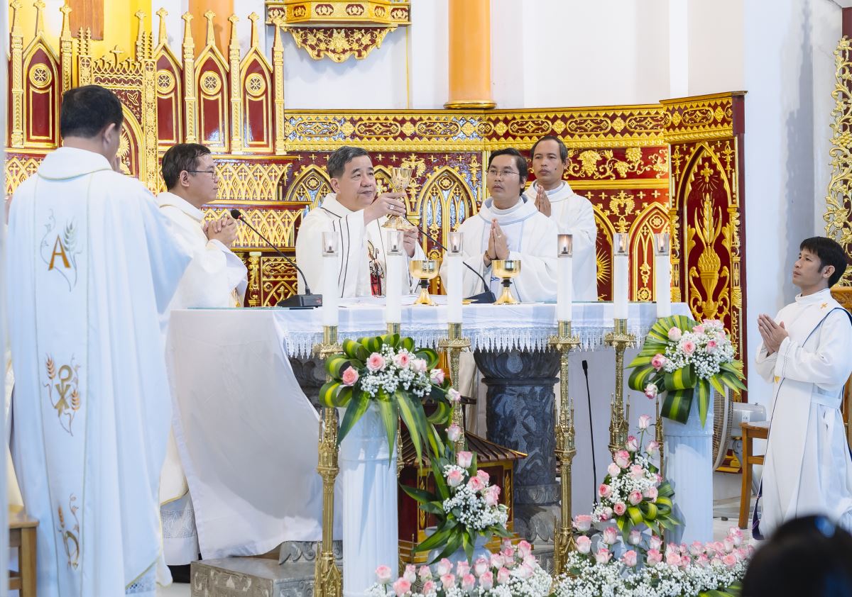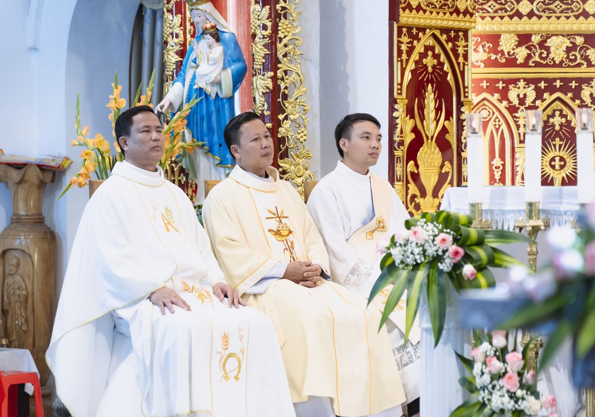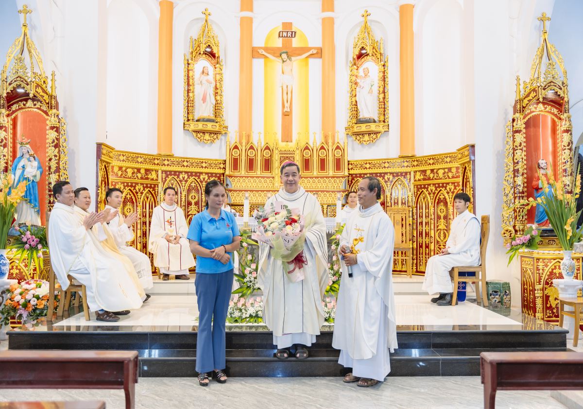 Đỉnh cao của buổi gặp mặt là Thánh lễ tạ ơn, do Đức cha Đaminh Hoàng Minh Tiến - Giám mục Chính tòa giáo phận Hưng Hóa chủ tế. Đồng tế với Đức cha trong Thánh lễ có cha xứ Giuse Nguyễn Văn Yêm, cha Chưởng ấn Phêrô Lê Quốc Hưng, quý cha Dòng Hiến sĩ Đức Mẹ Vô Nhiễm, quý cha khách. Hiệp dâng Thánh lễ có quý thầy, quý dì, quý hội đồng giáo xứ và Ban hành giáo, quý thành viên Bác ái Hiến sĩ và đông đảo bà con giáo dân trong giáo xứ. Đoàn đồng tế tiến lên cung thánh trong lời Thánh ca hân hoan: “Chúng con về nới đây dâng ngàn tiếng ca, chúng con về nơi đây để tạ ơn Thiên Chúa…”