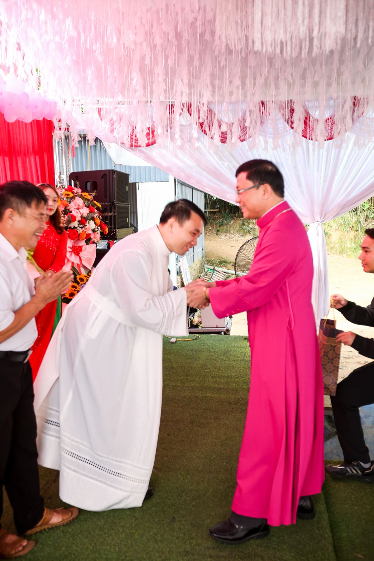 Sau Thánh lễ, quý cha, quý tu sĩ và quý khách cùng chia vui trong tiệc mừng tại khuôn viên nhà xứ.