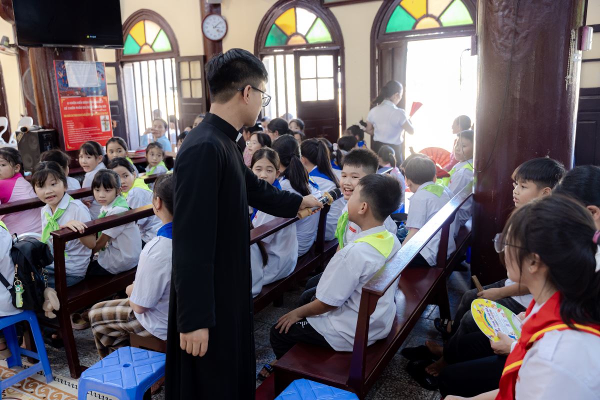Sau ít phút giải lao, thầy Phó tế tiếp tục chia sẻ với các em về khẩu hiệu sống của Thiếu nhi Thánh Thể: “Cầu nguyện – Rước lễ – Hy sinh – Làm tông đồ”.