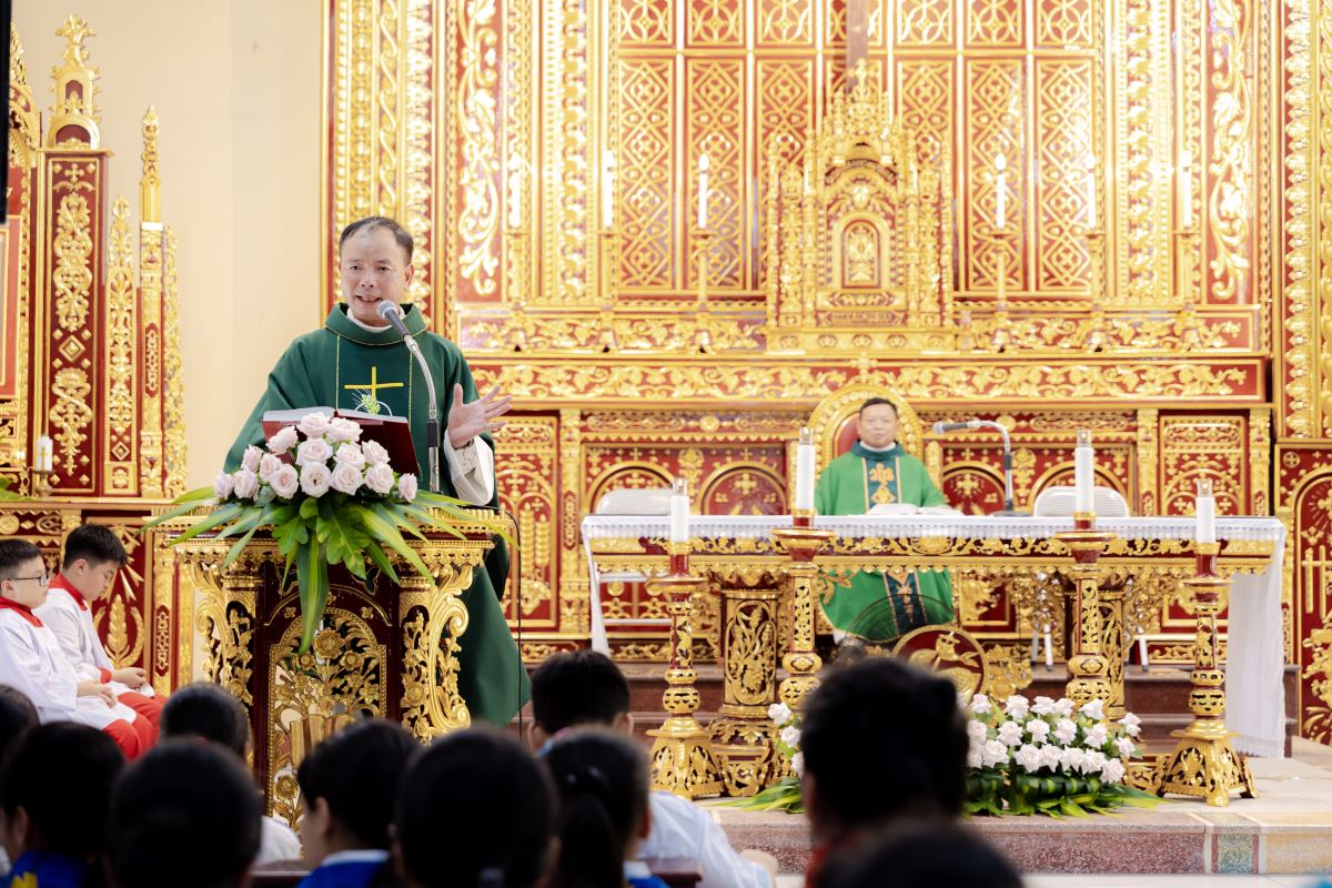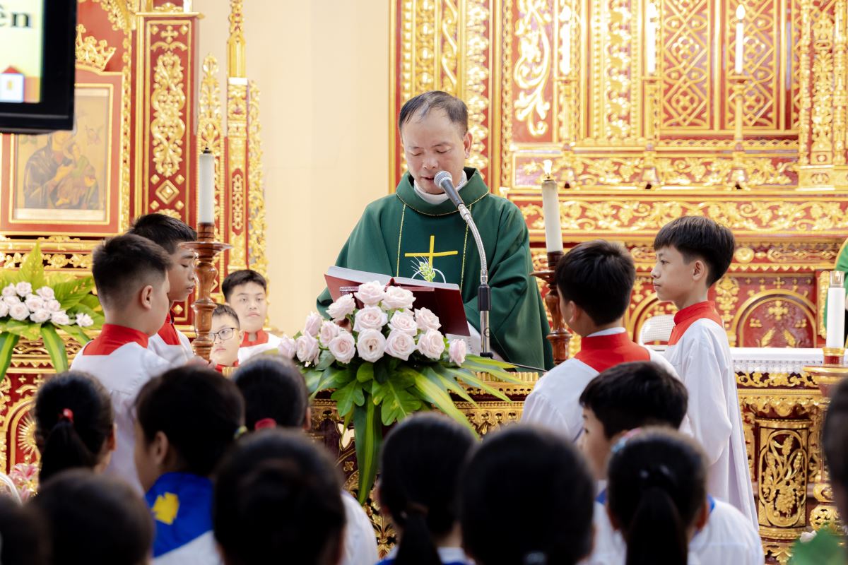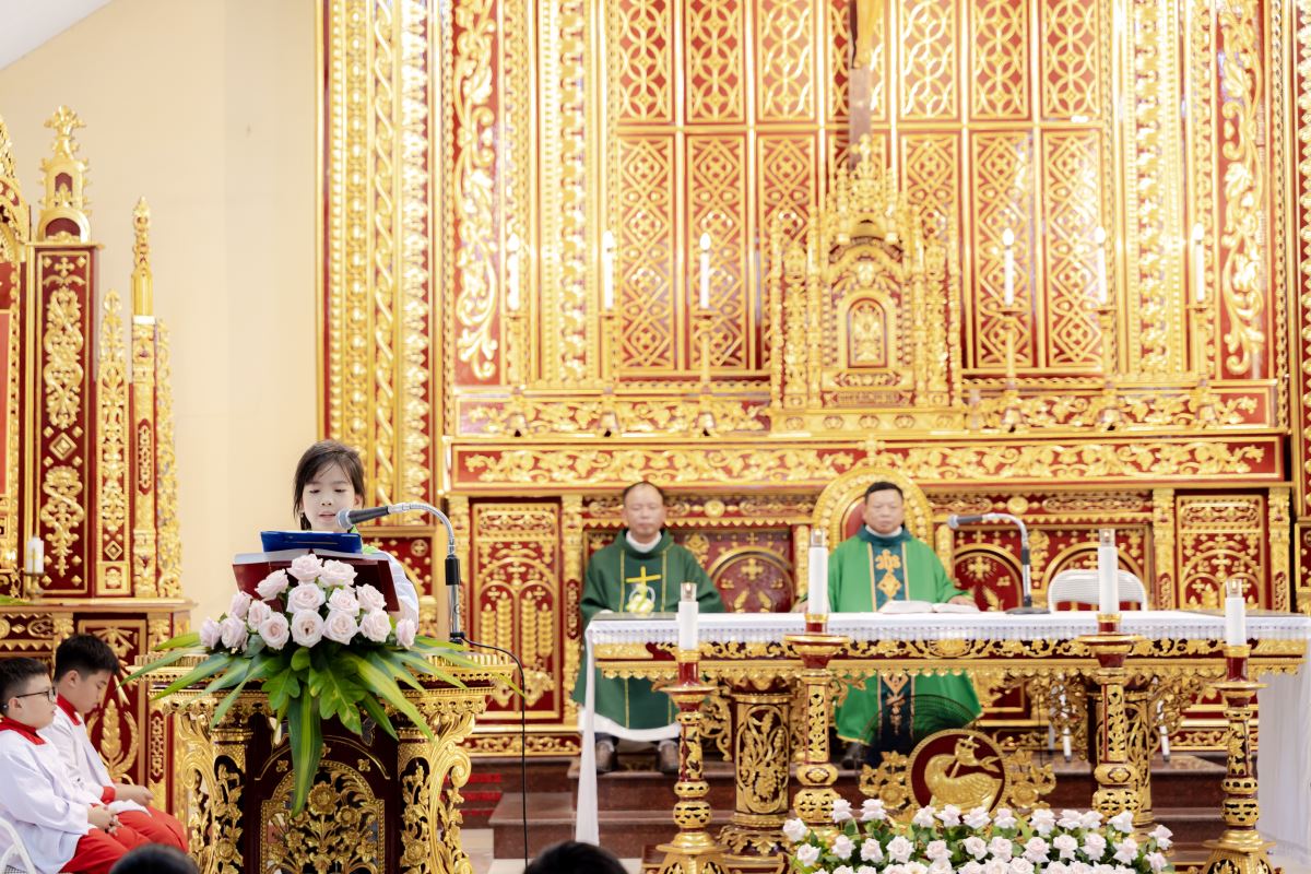 Mở đầu Thánh lễ, Cha chủ tế mời gọi các em và cộng đoàn hướng lòng về đền thánh Chúa, nơi chúng ta đến để gặp gỡ Ngài thân tình, để được đón nhận ơn tha thứ và bình an trong Chúa.