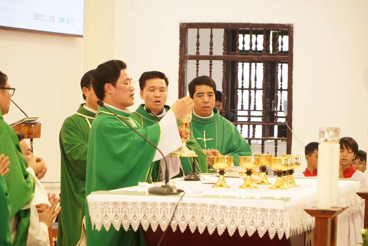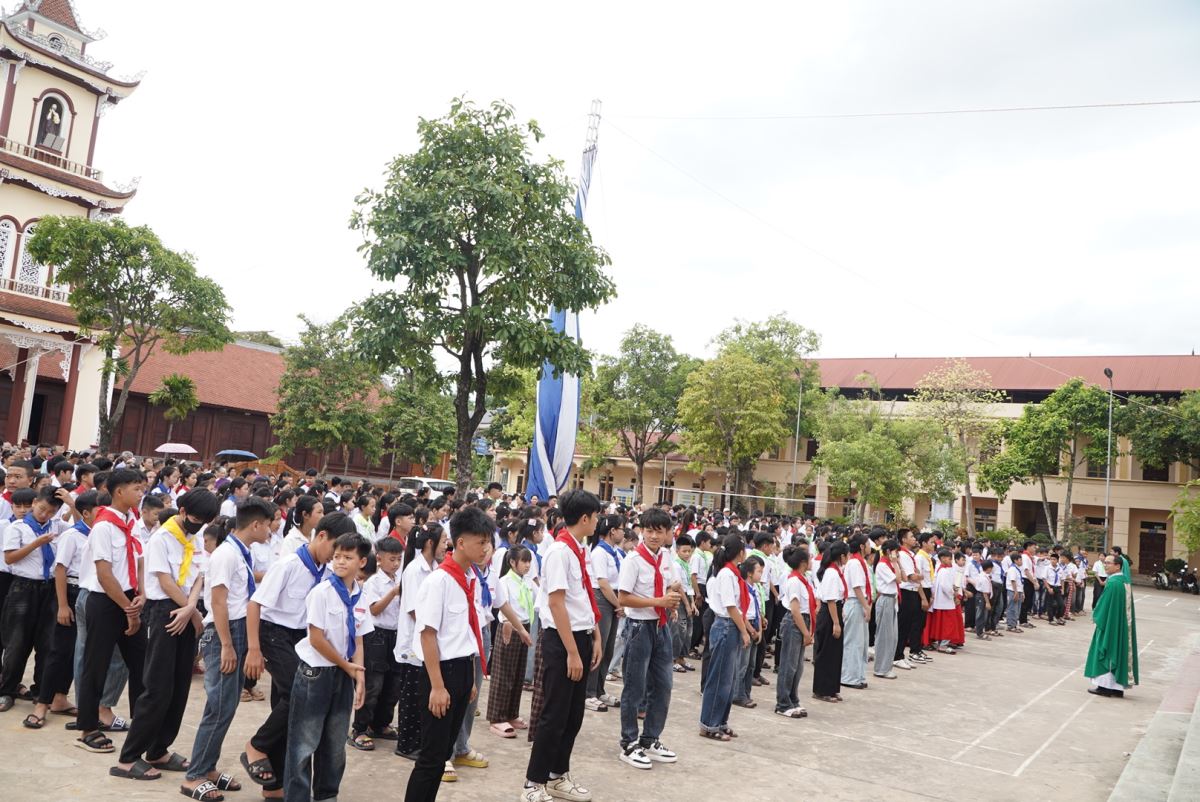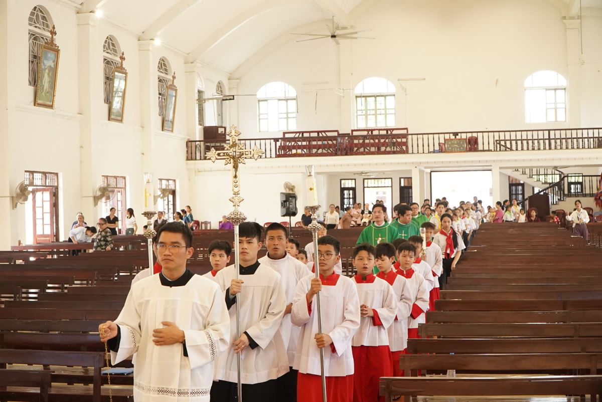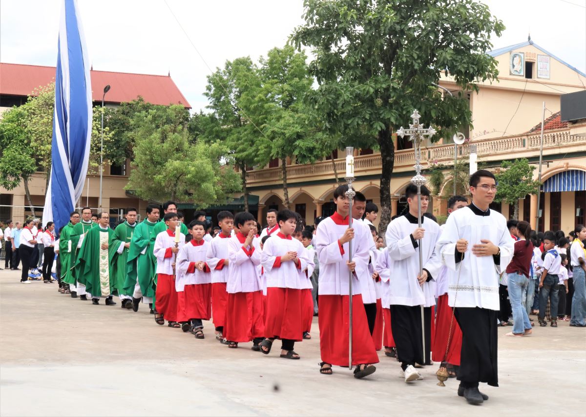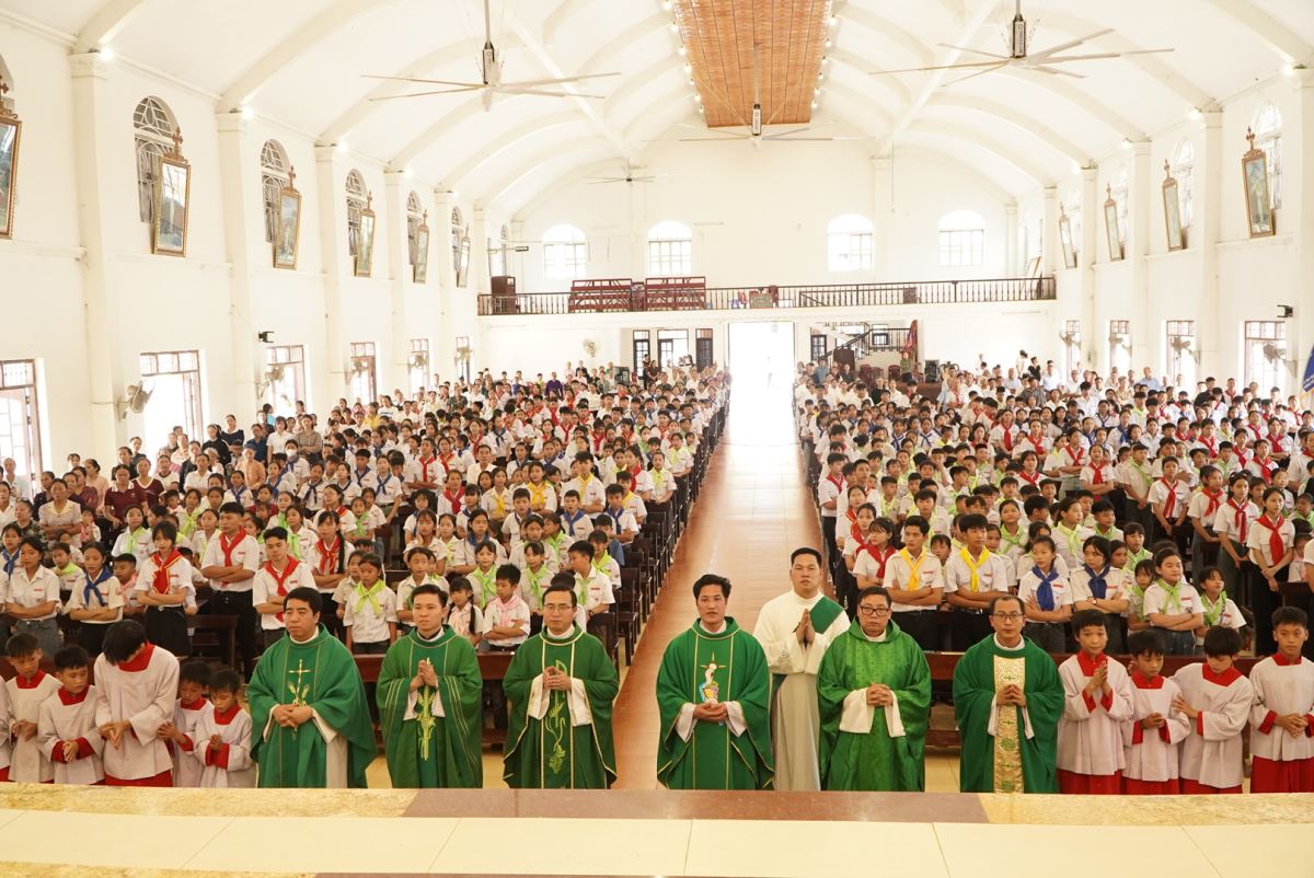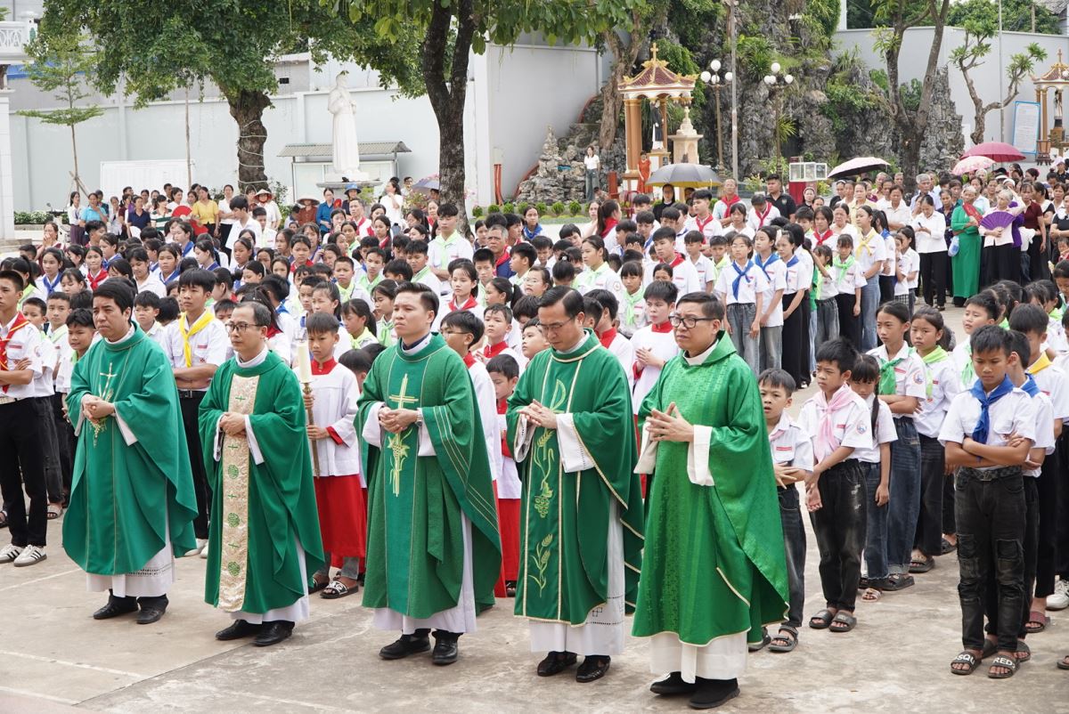 Đến 09g15, Cha Henrico Đinh Văn Khánh chủ sự Nghi thức hành hương. Sau nghi thức, đoàn hành hương long trọng tiến vào nhà Đa Năng hiệp dâng Thánh lễ. Đồng tế với Cha chủ tế có Cha Quản hạt Antôn Vũ Thái San, quý Cha trong giáo hạt, thầy Phó tế Phanxicô Lê Văn Tiến, quý Thầy Chủng sinh, quý Dì và đông đảo thiếu nhi, cộng đoàn dân Chúa.