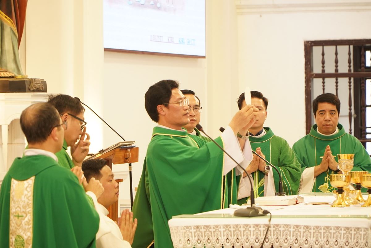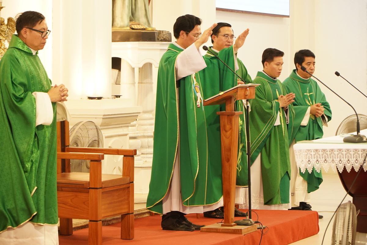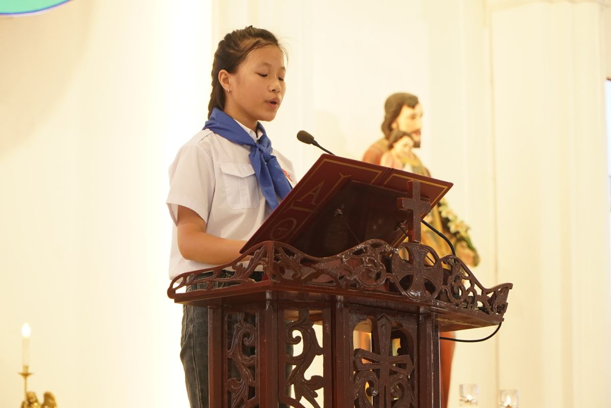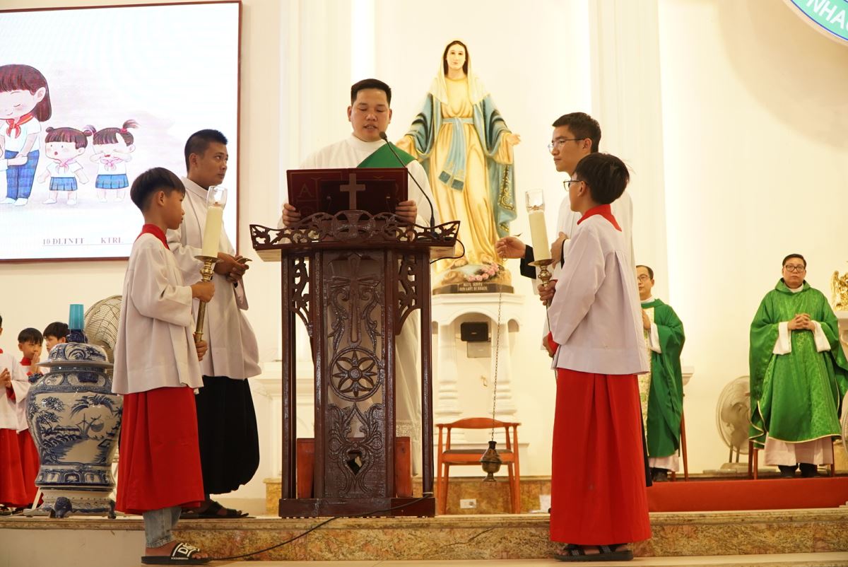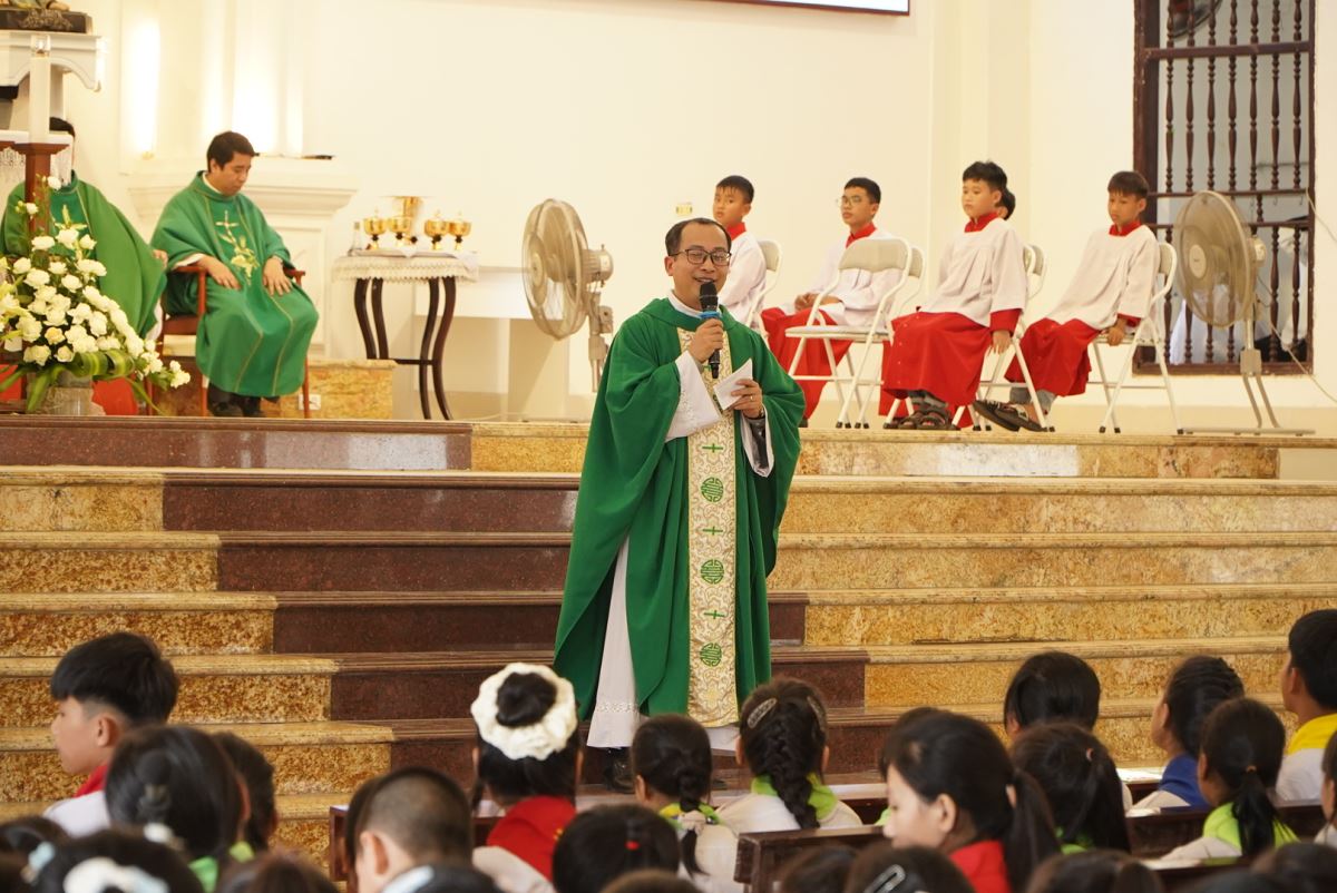 Mở đầu Thánh lễ, Cha Henrico mời gọi cộng đoàn, cách riêng các em thiếu nhi, chuẩn bị tâm hồn sốt sắng để tham dự Thánh lễ. Trong phần giảng lễ, Cha Vinh Sơn Vũ Văn Nguyện chia sẻ ý nghĩa lời kinh Lạy Cha theo Tin Mừng Matthêu (Mt 6, 9-13). Ngài mời gọi các em siêng năng cầu nguyện, luôn làm Dấu Thánh Giá và đọc Kinh Lạy Cha trong cuộc sống thường ngày như một lời tuyên xưng đức tin và ngợi khen Thiên Chúa.
