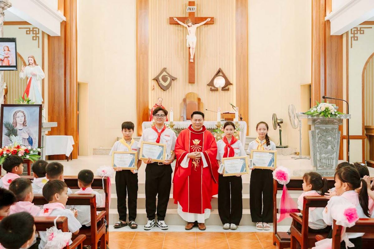 Sau Thánh lễ, Cha xứ và thầy xứ đã trao phần thưởng cho các em đạt giải cuộc thi “Rung Chuông Vàng”.