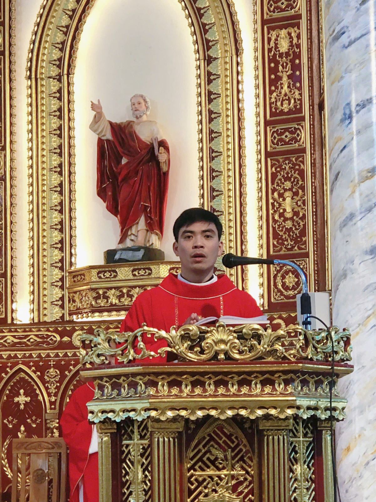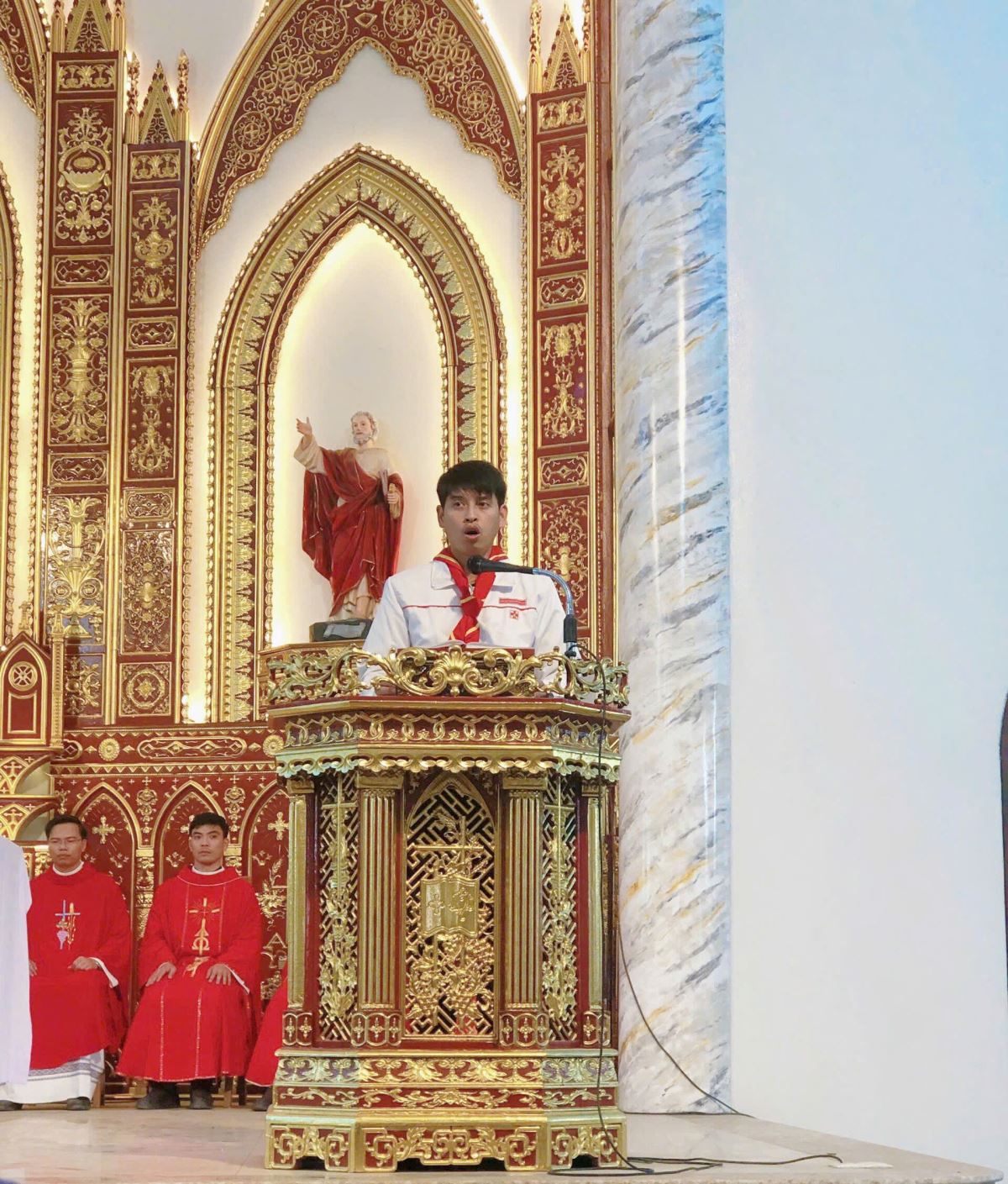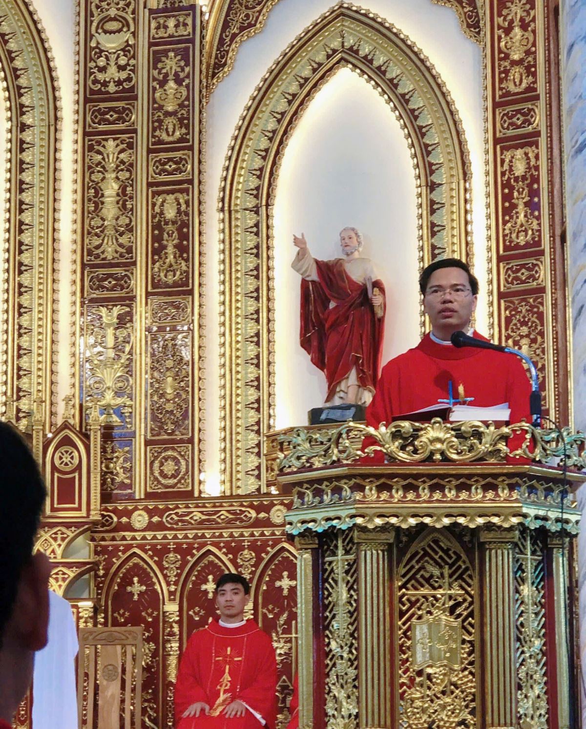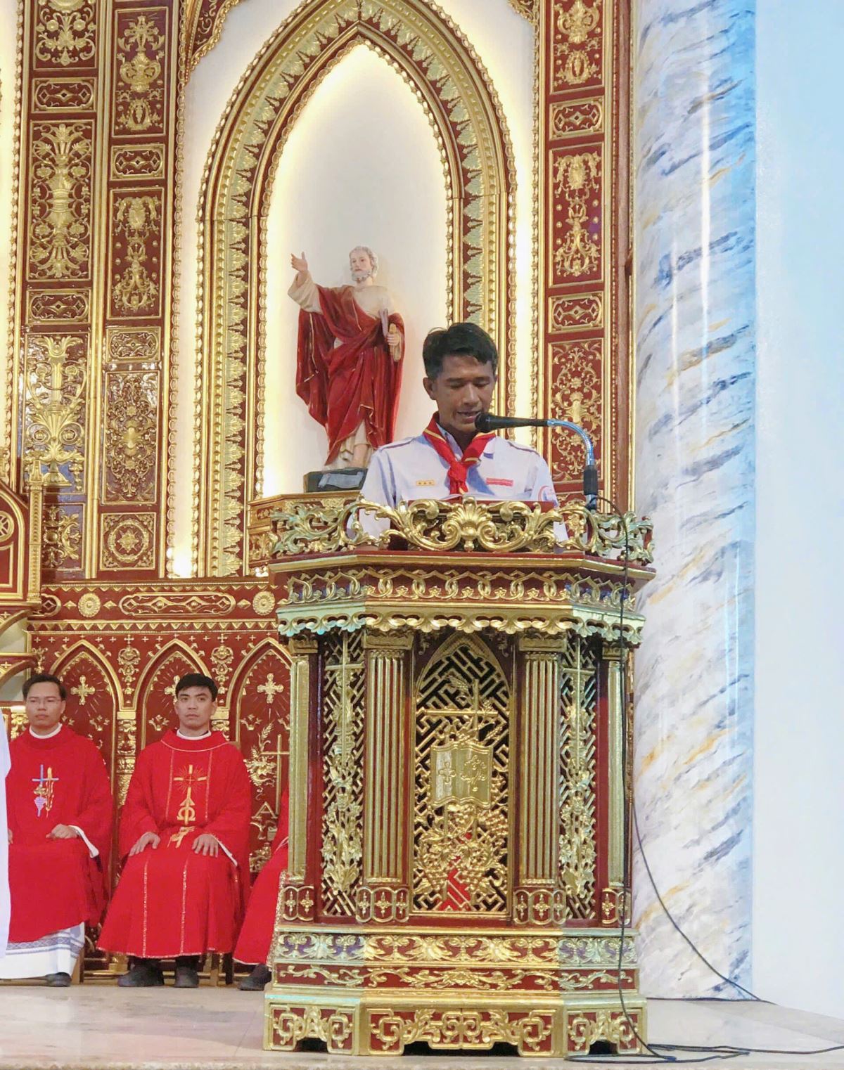 Giảng trong thánh lễ, cha Giuse Nguyễn Ngọc Bích, phó Tuyên úy Liên đoàn đã mời gọi mọi người, cách riêng là các Huynh trưởng noi gương thánh Bổn mạng để tuyên xưng đức tin và hăng say phục vụ cộng đoàn. Cách cụ thể là hãy luôn sống xứng đáng là người Huynh trưởng mẫu mực của Chúa ở bất cứ môi trường nào.