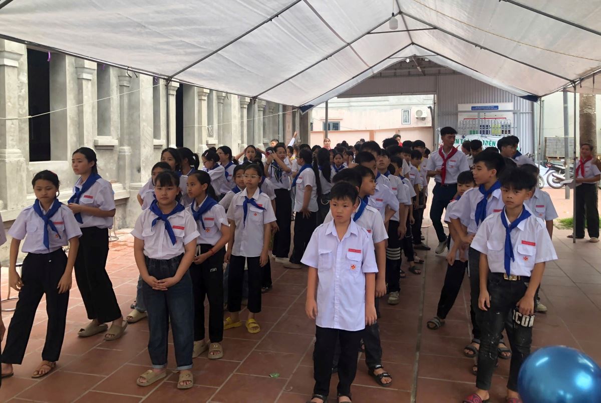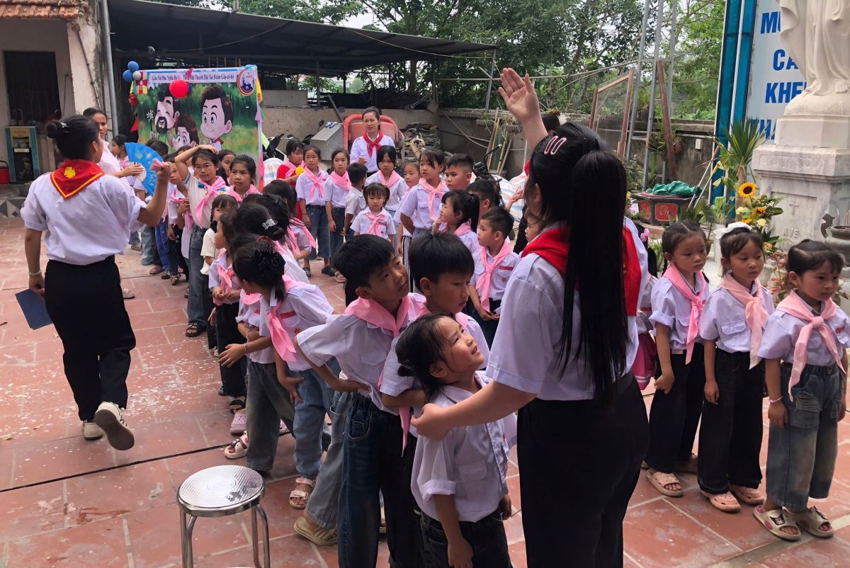 Sau Thánh lễ, các em tập trung tại sân nhà thờ để tham dự nghi thức chào cờ khai mạc chương trình ngày hội, với chủ đề
