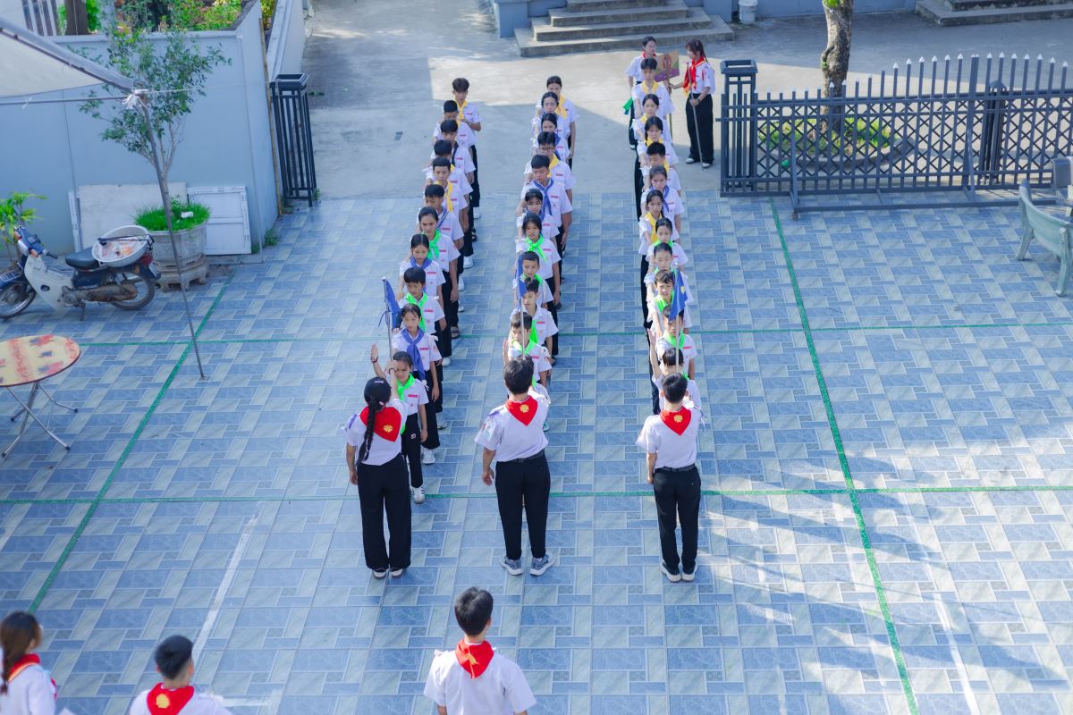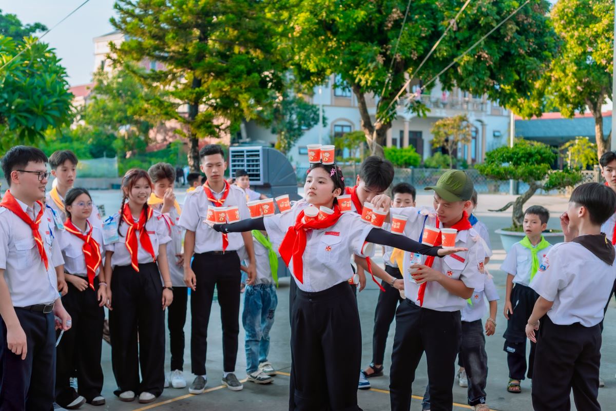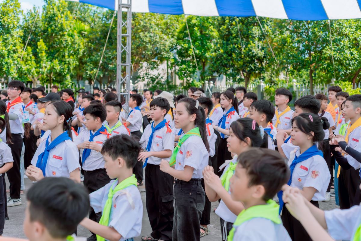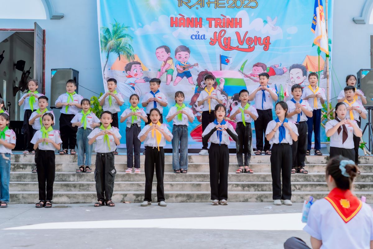 Ngày trại thứ nhất Ngay từ chiều ngày 02.8.2025, sân trại đã rực rỡ sắc màu với những nụ cười, những lá cờ đội bay phấp phới, và tiếng reo hò phấn khởi của các em nhỏ. Dù thời tiết oi nóng, tinh thần hăng say và lòng nhiệt huyết vẫn rạng ngời trên gương mặt của các em bằng khởi động cử điệu bài hát chủ đề “Hành khúc hy vọng”.