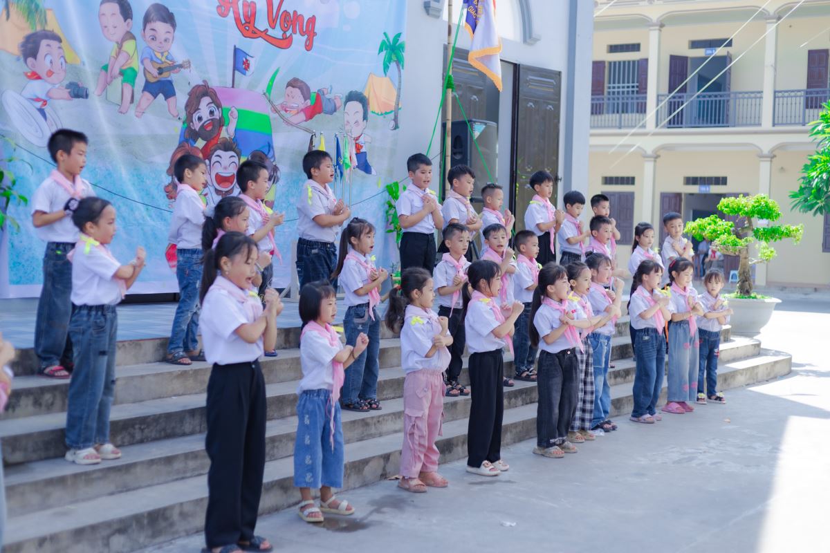 Ngay sau đó là nghi thức chào cờ. Cha xứ Giuse Nguyễn Văn Ninh đã khai mạc trại hè và chia sẻ câu chuyện dưới cờ, ý lực sống đầy ý nghĩa.